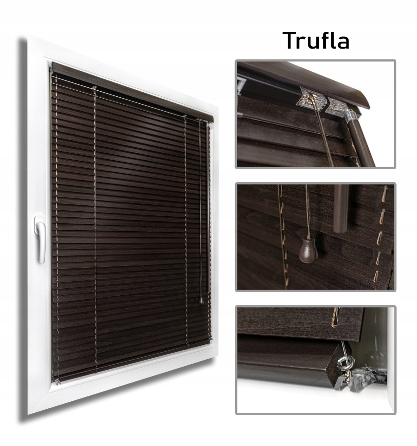 ➡️ Підйомний шнур завершується дерев’яним грибом, а для обертання ламелей використовується ручка.
