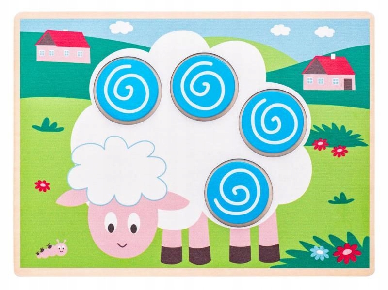 - 5 двосторонніх дерев’яних дощок із візерунками, що дає до 10 різних готових варіантів компонування – ви знайдете багато цікавих малюнків із метеликом, транспортними засобами, вівцями, повітряним змієм тощо.