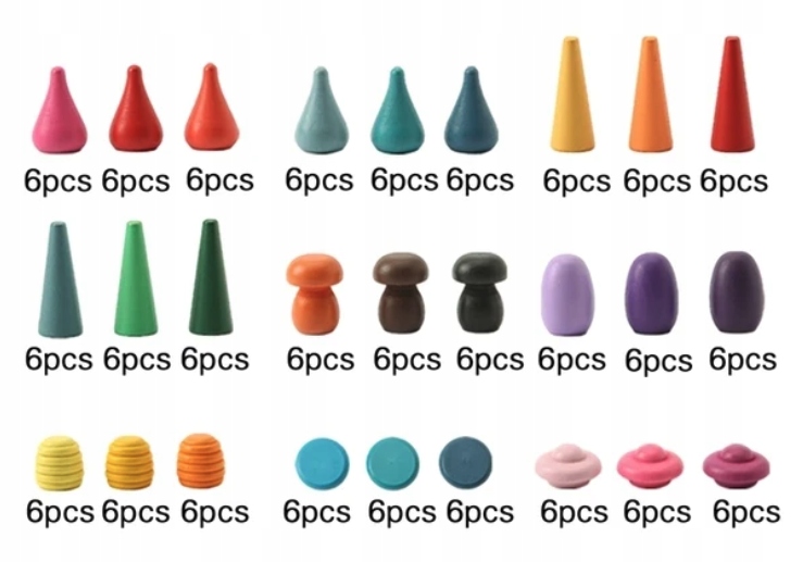 9 різних форм різних кольорів, включаючи краплі дощу, гриби, дерева, стільники, ґудзики та монети різноманітних кольорів і відтінків.