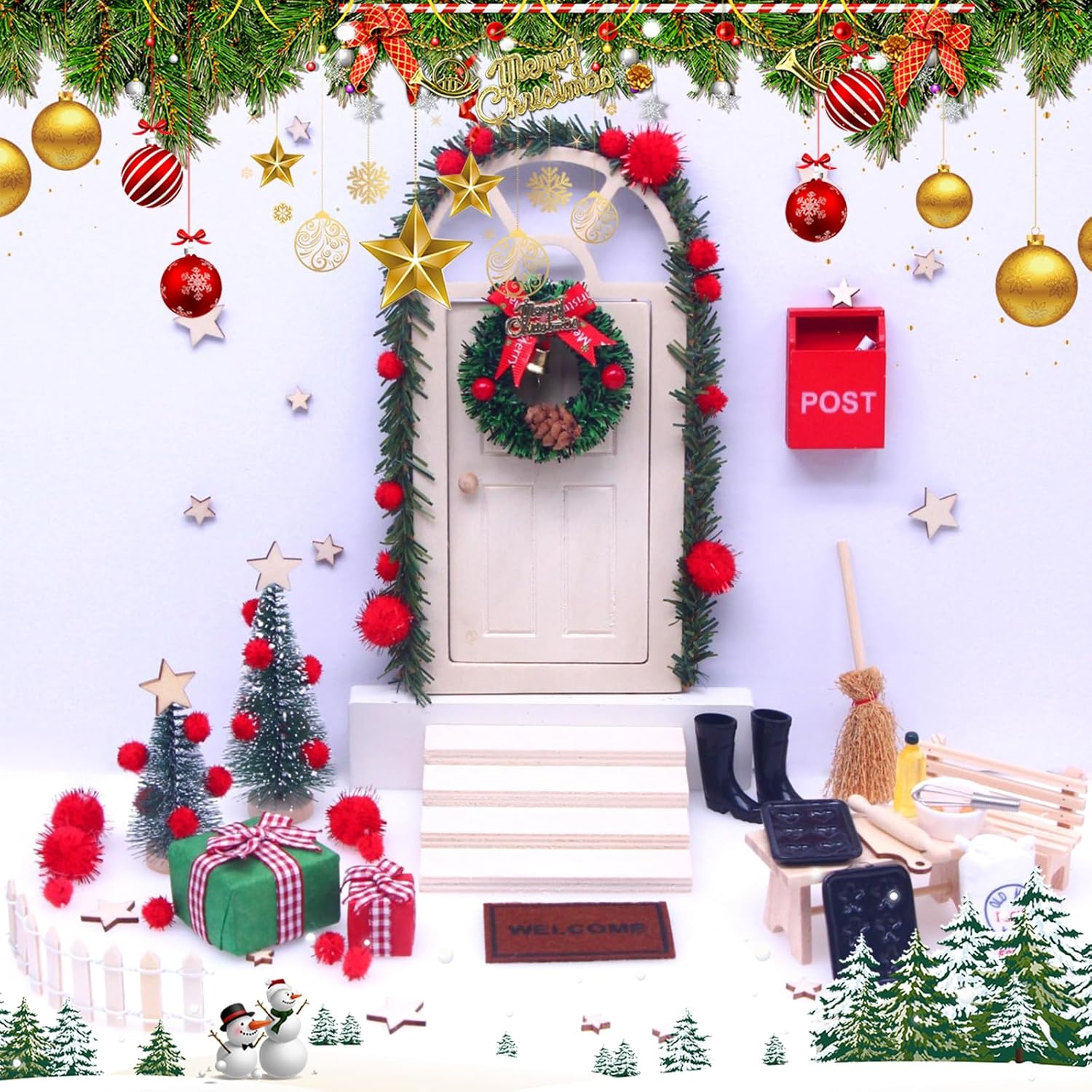 - Ви отримуєте: У набір входять 1 дерев’яна дверцята-гном, 1 гірлянда, 1 гірлянда, 1 драбина, 2 ялинки, 2 подарунки, 2 паркани, 1 килим, 2 взуття, 1 поштова скринька, 1 лист, 1 мітла, 13 зірок, 30 червоних кульок, набір кухонних аксесуарів (1 стіл, 1 стілець, 1 борошно, 1 яйце, 1 віночок, 1 пляшка олії, 1 обробна дошка, 1 качалка, 2 посуду для випічки).