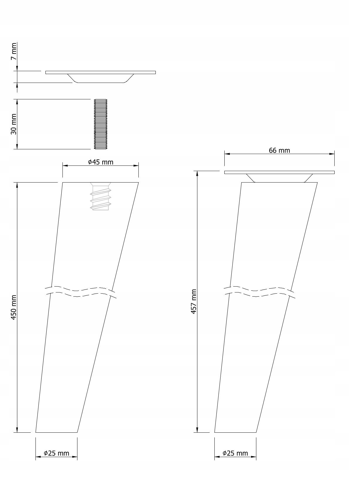 Ніжка букова необроблена, точена у вигляді конуса діаметром зверху 45 мм, знизу 25 мм. Ніжка має гвинтове гніздо M8 x 24 мм. Разом з ніжкою ми додаємо монтажну пластину, яку можна легко прикріпити до основи меблів за допомогою конічних гвинтів - доступні на інших наших аукціонах. Встановлення також можна здійснити за допомогою розеток, угвинчених у деревину з внутрішньою різьбою М8. Щоб захистити основи, ми рекомендуємо наші доступні ковзанки або повсті. Ніжку можна пофарбувати безбарвним лаком або відтінити будь-яким кольором морилкою або лаком відповідно до ваших потреб. Ніжки доступні різної висоти - як прямі, так і похилі.