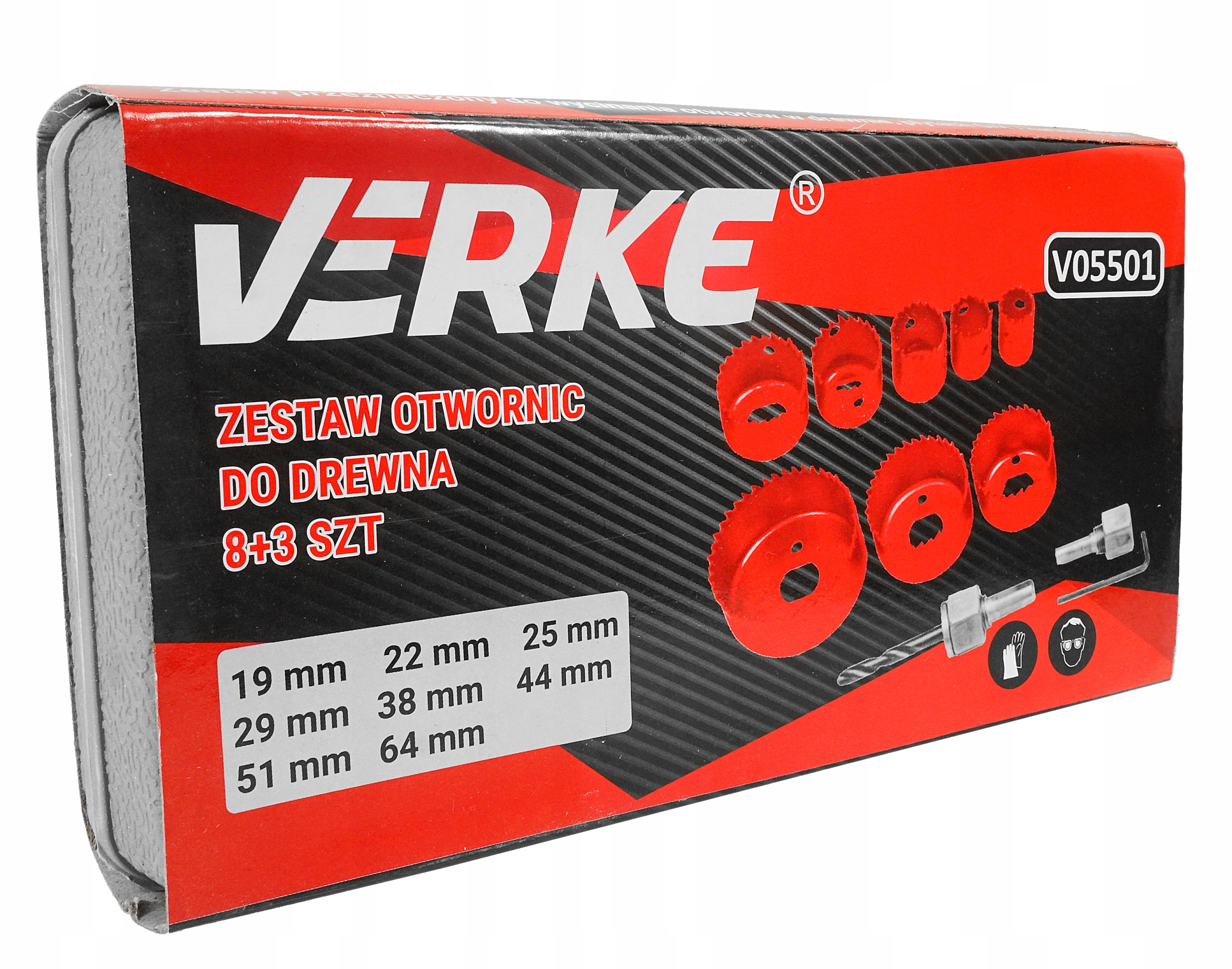 Набір, призначений для вирізання отворів у деревині, г/ K табличках та картону. Набір корисний для обробки, гідравлічних та електричних робіт. Отвори використовуються для вирізання отворів великого діаметру, вирізаючи лише по периметру отвору. Форма свердла має форму циліндра, закінчену різкими зубцями.
