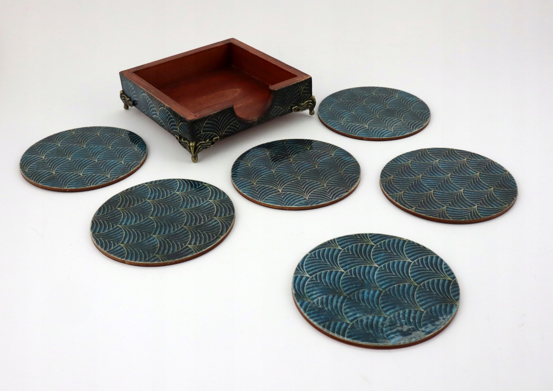 Відкрийте унікальний набір дерев’яних подушок (6 шт.) У комплекті з елегантною коробкою, яка буде ідеальною як прикраса таблиці та практичне доповнення до інтер’єру . Їх поверхня прикрашена тонким золотим малюнком Fanchers на тлі темного темно -синього та зелені, виготовленого на рисовому папері , що надає їм розкішний вигляд.