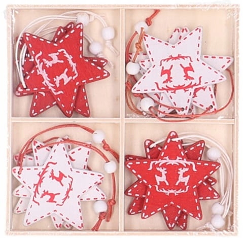 Набір білих та червоних дерев’яних підвісок 12 штук у дерев’яній упаковці, ідеально підходить як декоративний елемент під час Різдва та подарунок. Підвіски чудові як прикраса ялинки та доповнення до різдвяного очерету. Звичайно, їм сподобається всі любителі скандинавського стилю.