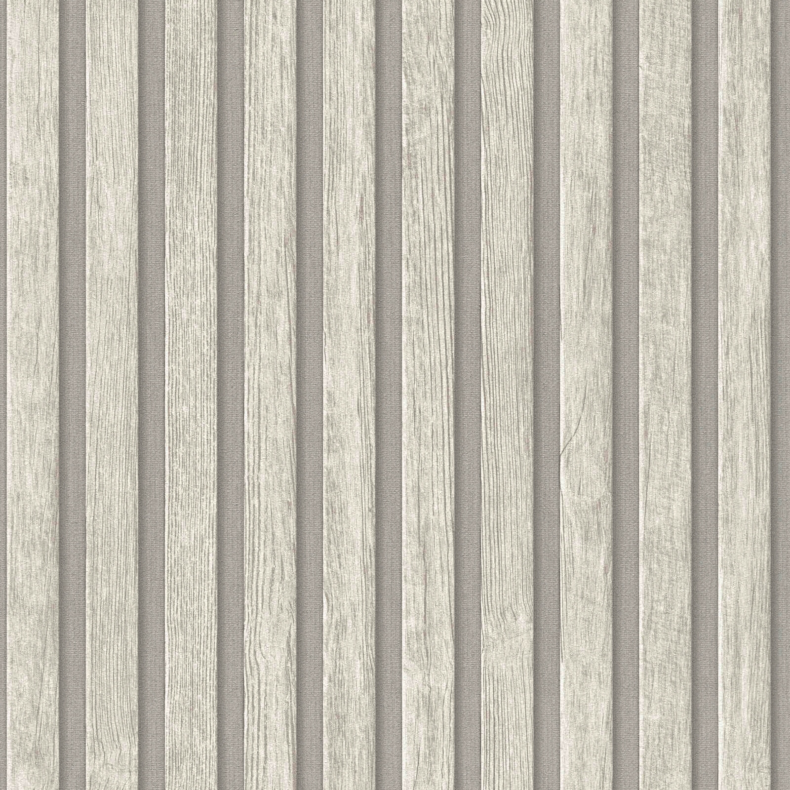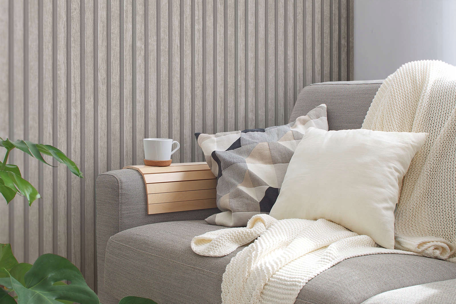 Сучасні шпалери з візерунком з натуральних дерев'яних ламелей світло-сірого кольору на сірому фоні з гладкою структурою, що створює тривимірний ефект. на стіні.