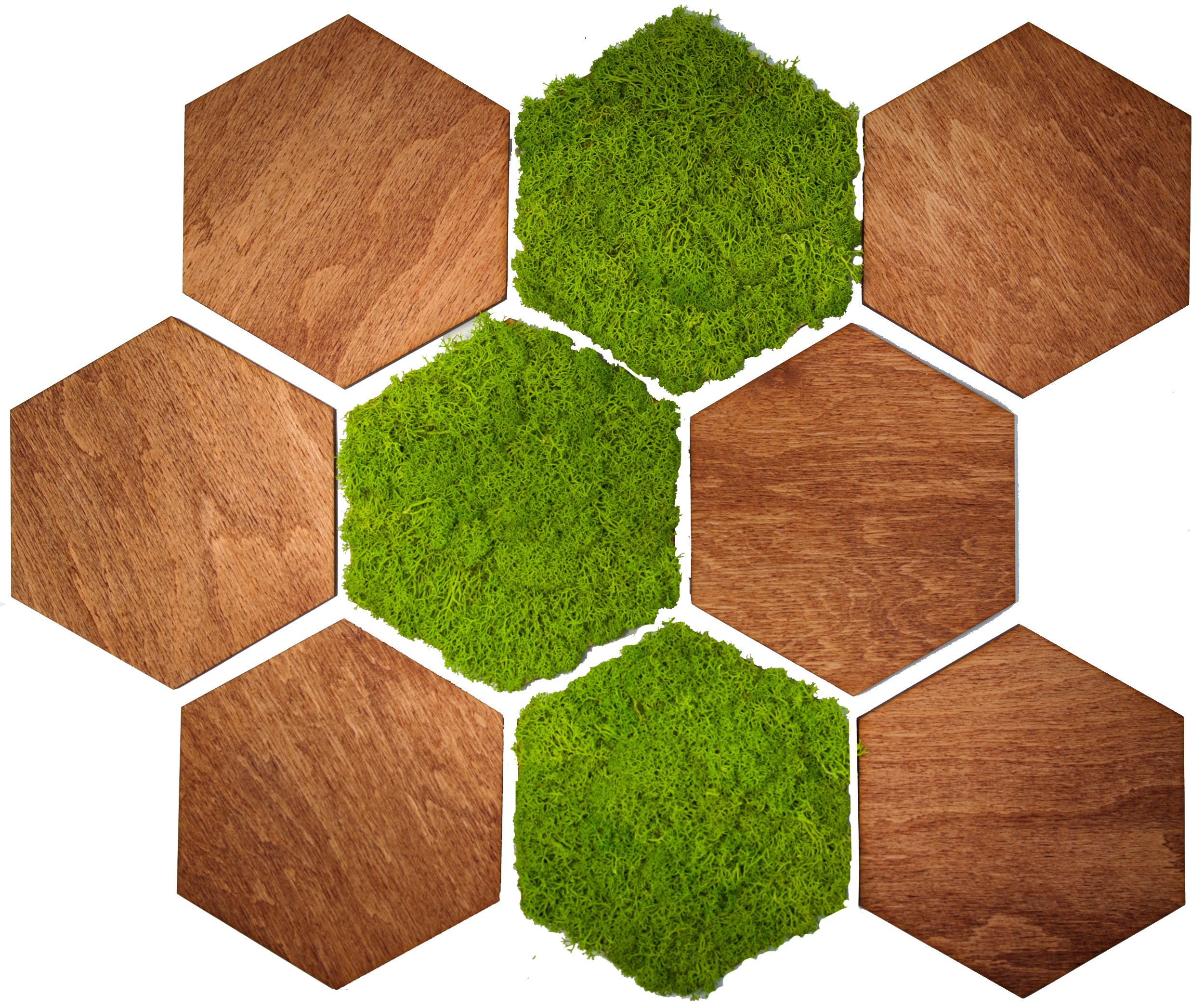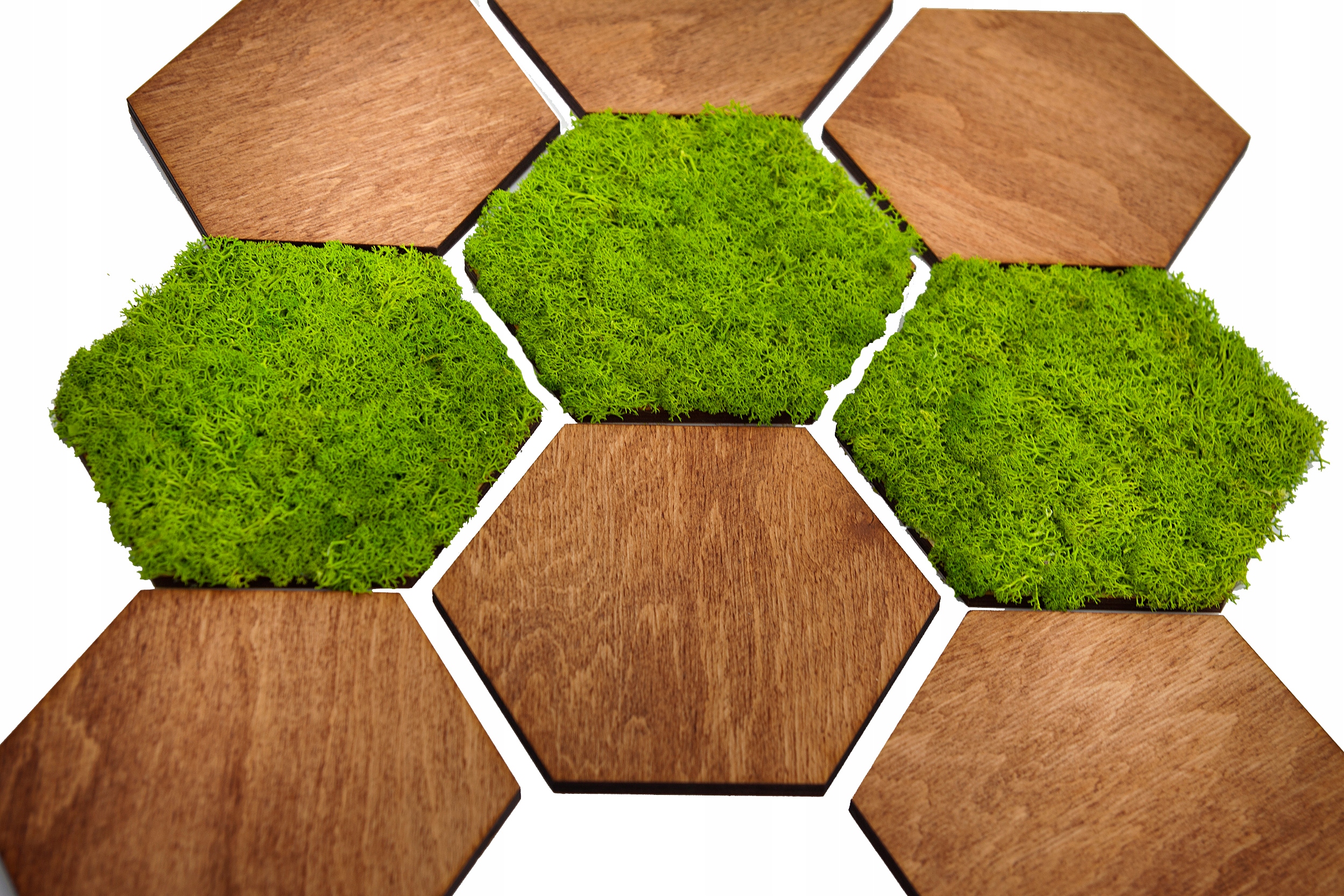 Набір складається з 9 дерев'яних шестикутників, 3 з яких покриті зрізаним весняним зеленим мохом.
