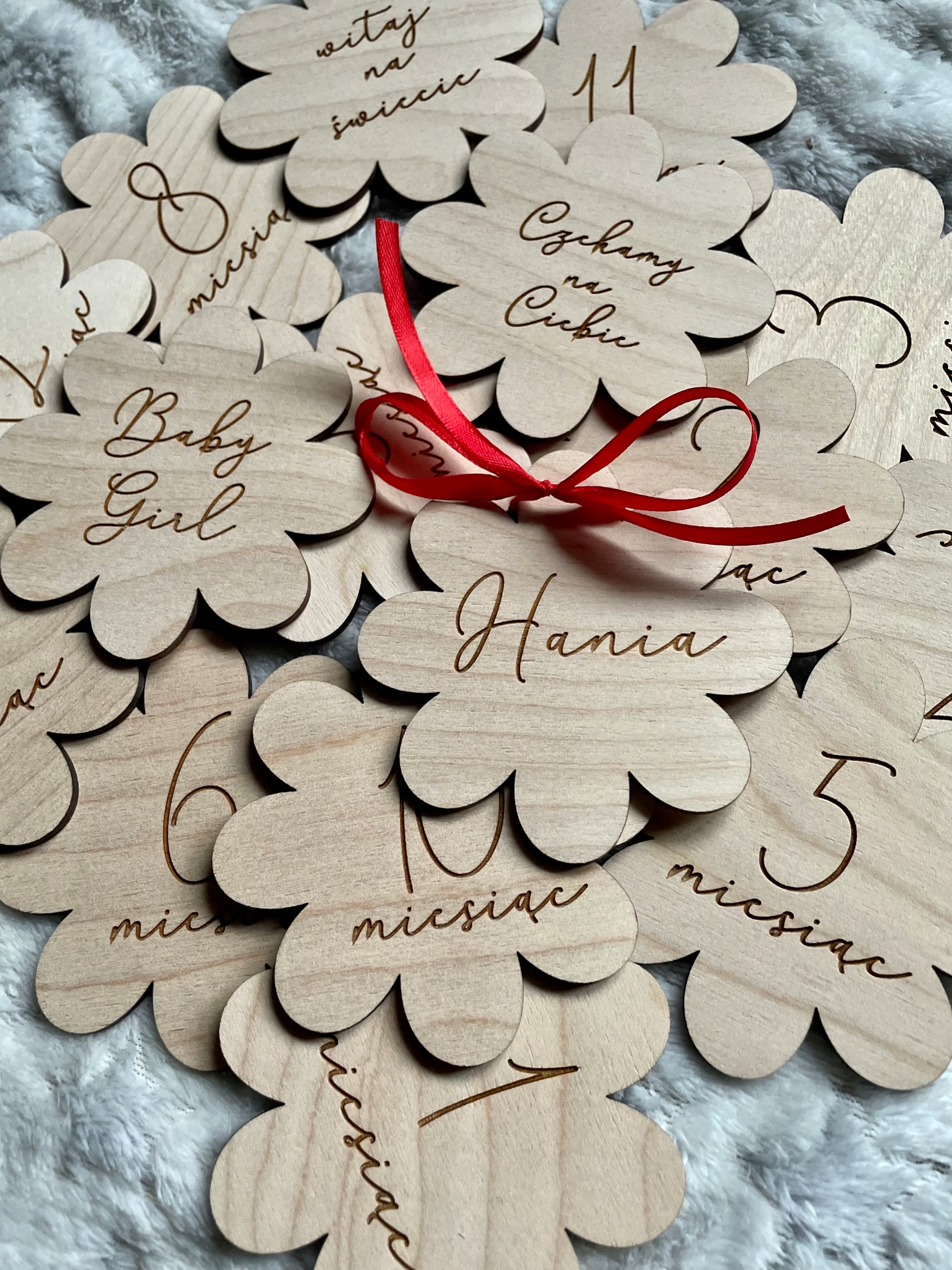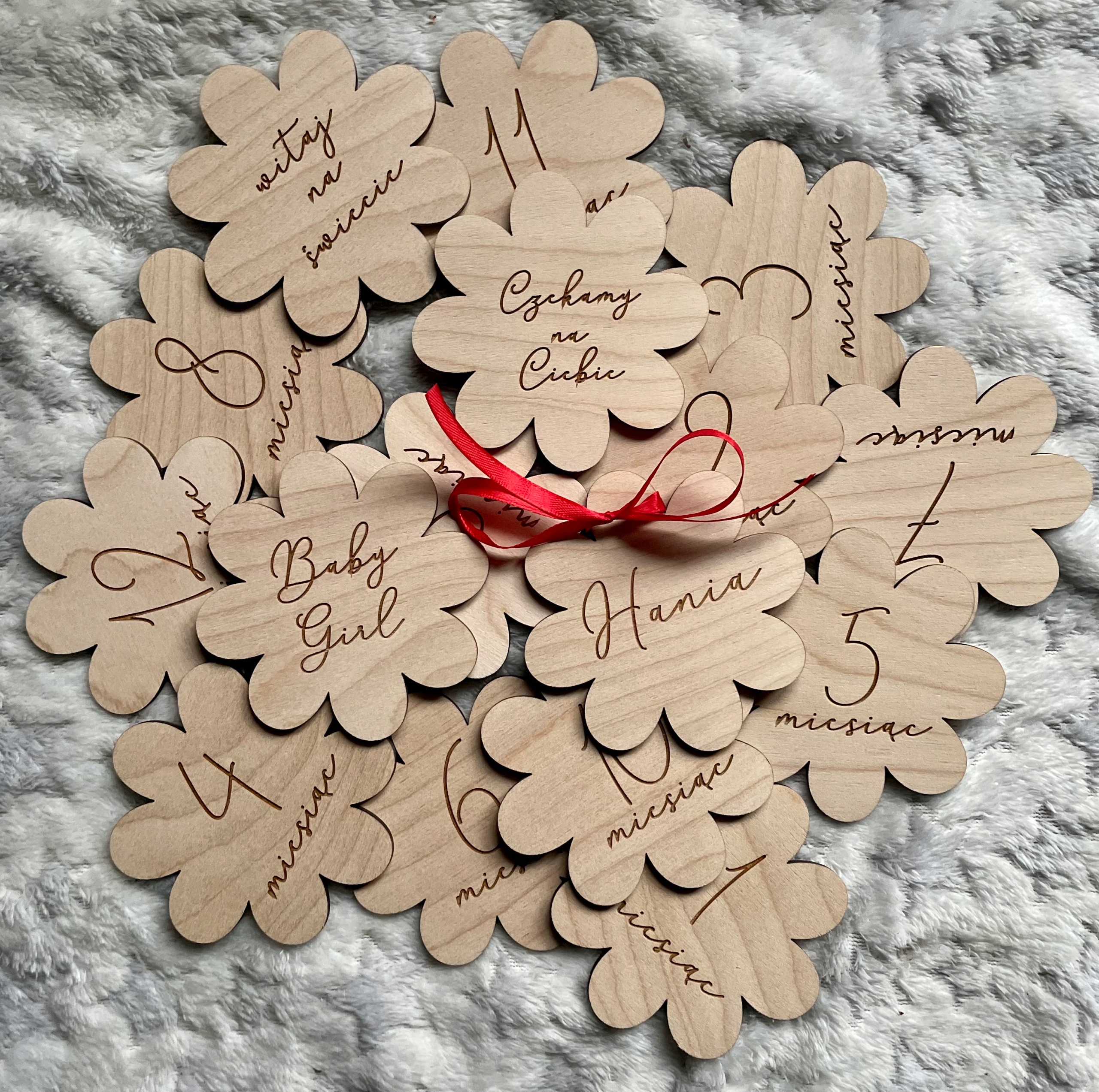 Дерев'яні дошки для фотографій малюка - ПЕРШИЙ РІК ЖИТТЯ - 16 шт + бантик + декоративна коробка
