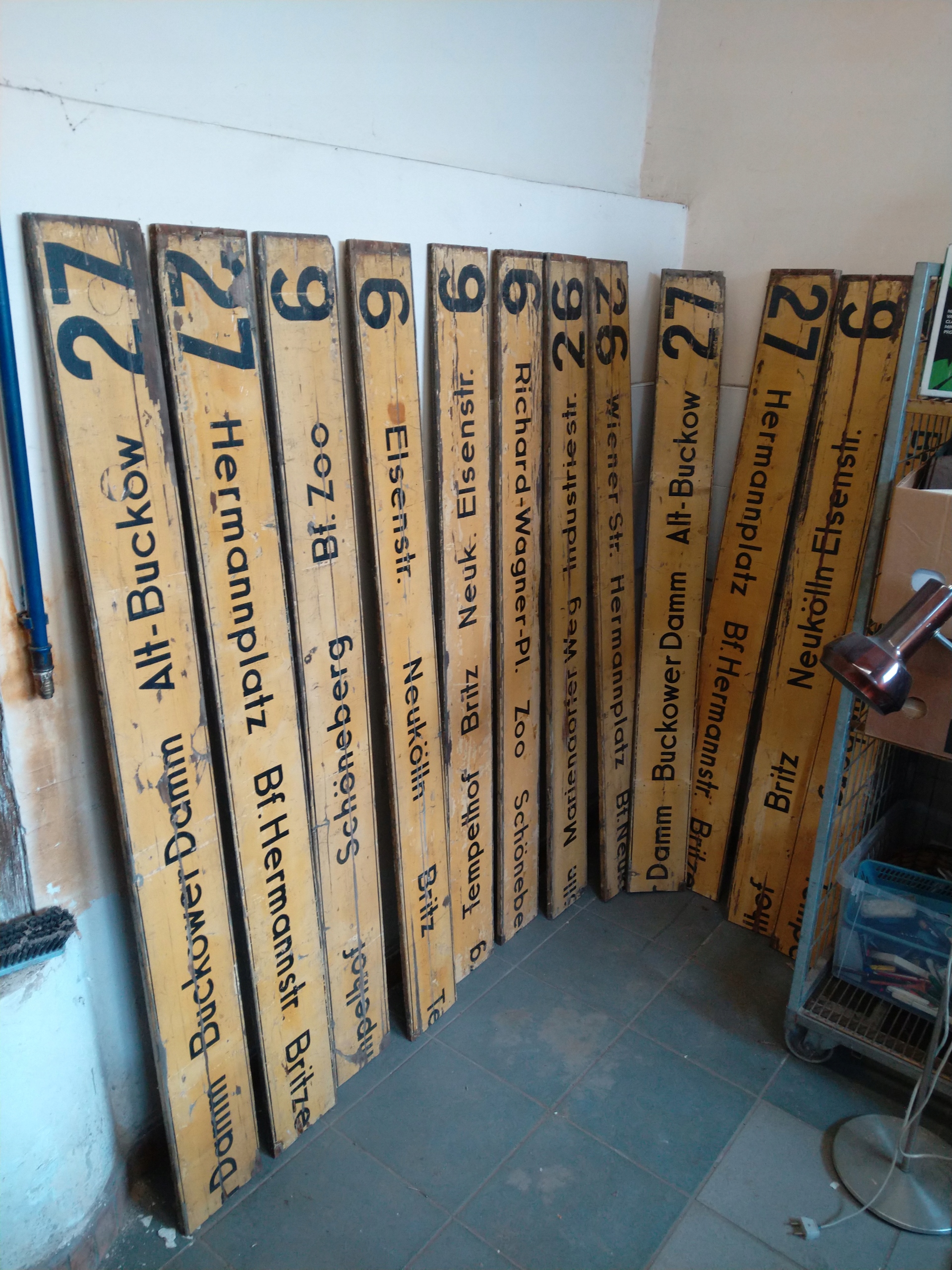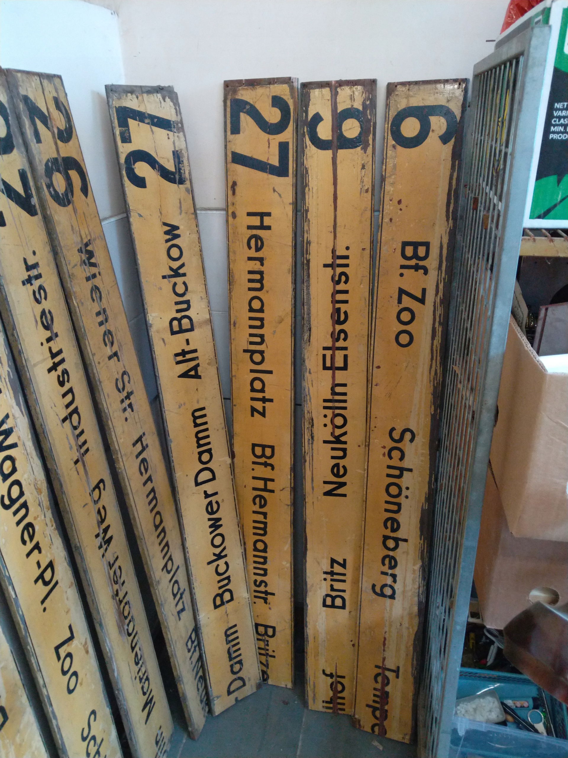 Пропозиція стосується однієї пари вказівників на дереві з Берліна 1950-х років, табло з номером 27 від Hermannplatz до Alt-Buckow, повний знак складається з двох елементів розмірами 160x17x1,5, тобто довжина набору становить 320, в хорошому стані, візуально по фото видно потертість від часу, інші марки є в інших моїх пропозиціях.