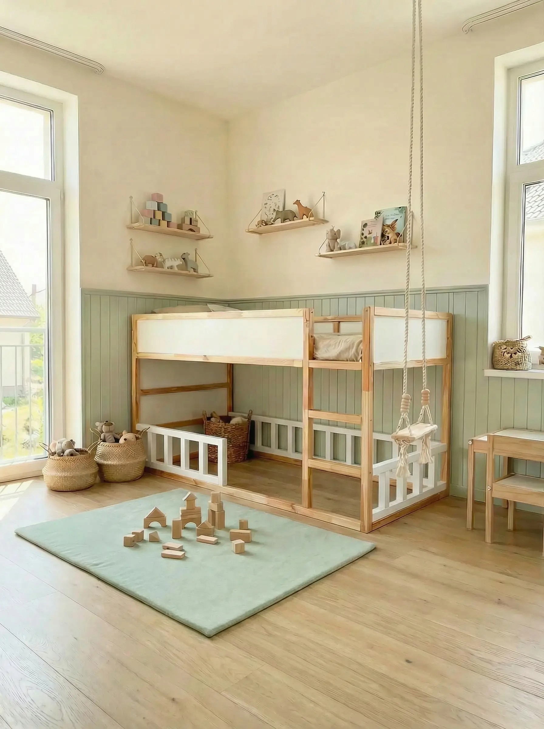 Це розташування захищає три сторони нижнього рівня ліжка, залишаючи зручний вхід зі драбини.