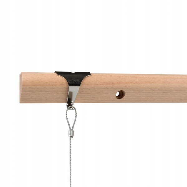 Дерев’яна смуга з довжиною 2 м -це елегантний спосіб створити власну галерею для призупинення зображень, фотографій та предметів. Для того, щоб прикріпити кабелі (упорядковані окремо) слід використовувати спеціальні гачки, які ми застосовуємо до профілю смужок (упорядковано окремо).