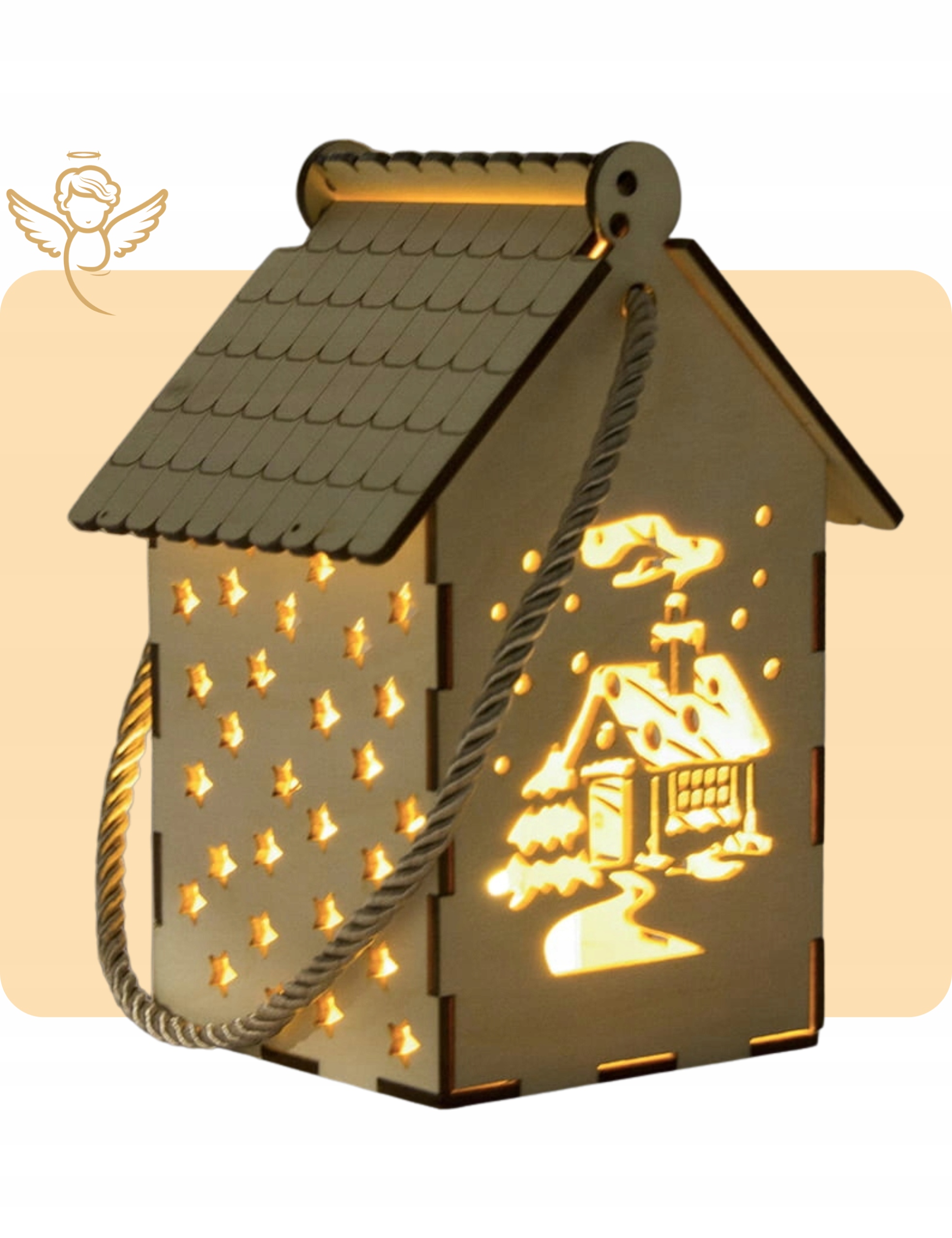 Чудовий зібраний вручну дерев'яний ліхтар польського виробництва, створений для Роратів та періоду Адвенту. Виготовлений з високоякісної деревини берези (фанера товщиною 3 мм), ліхтар оснащений світлодіодним освітленням, живиться від батарейок, які входять в комплект. Тепле світло створює затишну атмосферу, а численні вирізи на стінках ліхтаря чудово розсіюють сяйво. Завершується все декоративним шнурком, який дозволяє зручно тримати ліхтар або повісити його де завгодно.