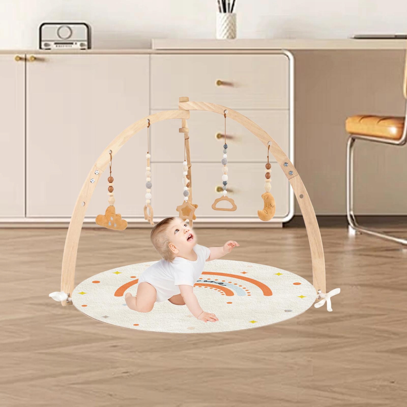 [різні способи гри]: дерев'яний тренажерний зал пропонує способи гри для підтримки вашого розвитку. Regardless of whether you lie down, lie on your own or sit, can develop the skills of gripping, lifting the head, crawling exercises and stability