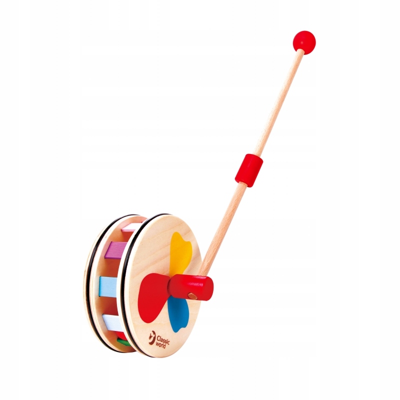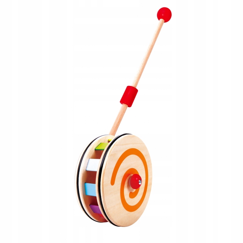 - Найкращий штовхач класичного світового бренду. Він складається з ручки, з якою запускається іграшка, та колеса з гумовими краями, що робить її тихою та комфортною. Іграшка має барвисті картини з обох боків кола та барвисті елементи між двома його елементами. Як результат, кольори прекрасно складаються під час руху, а дитина бачить веселкові смуги.