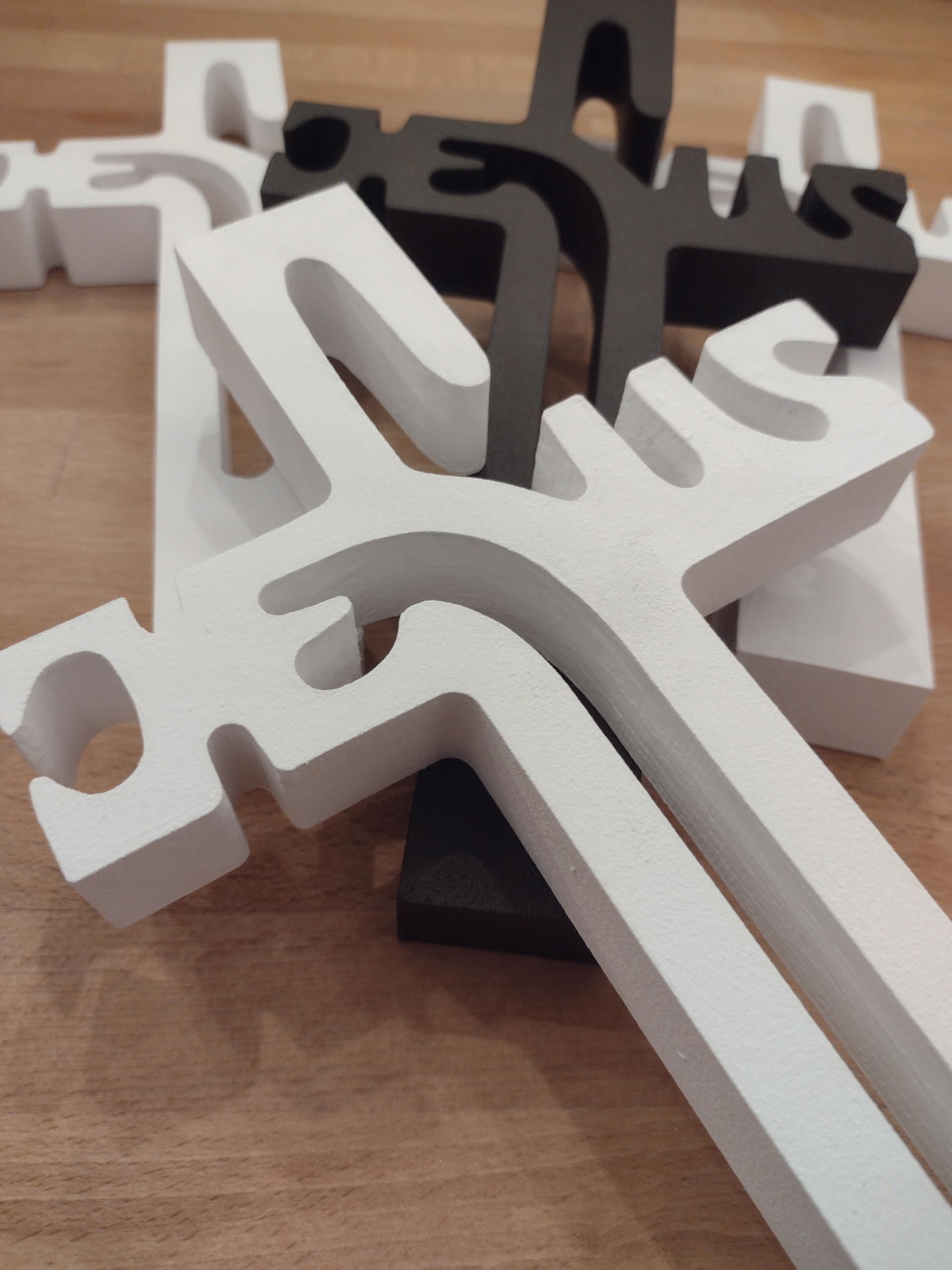 Оригінальний хрест виготовлений з дерев'яної плити МДФ товщиною приблизно 23 мм, що забезпечує його стабільність у положенні стоячи.