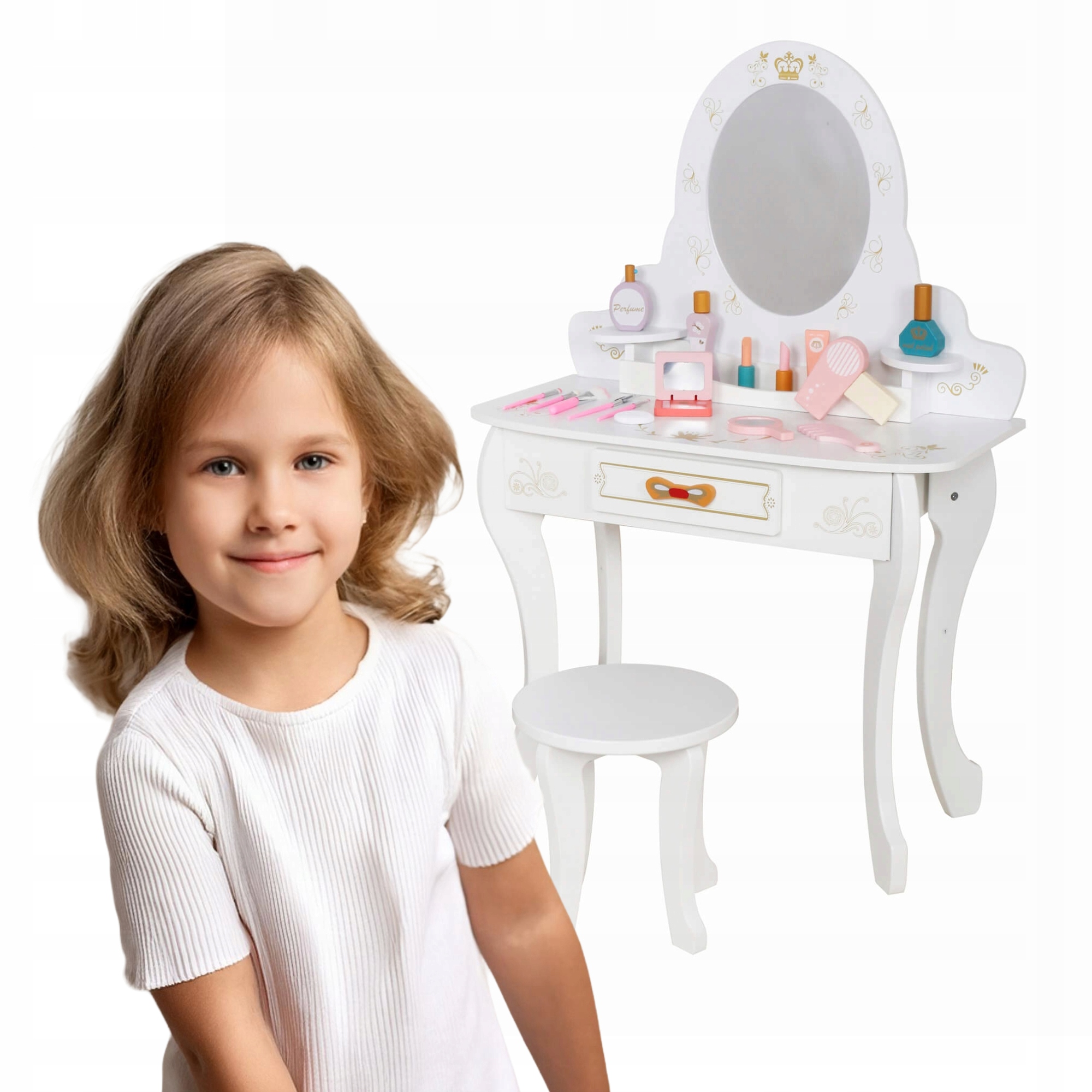 ДЕРЕВ'ЯНИЙ БІЛИЙ ТУАЛЕТНИЙ СТОЛИК KINDERLLY З АКСЕСУАРАМИ табурет сушарка парфумів