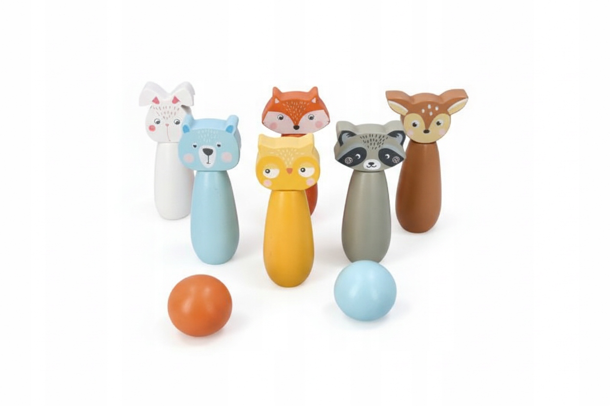Кеглі для боулінгу виготовлені з натурального дерева та ретельно пофарбовані, приділяючи увагу кожній деталі. Це іграшка, яка поєднує в собі естетику, довговічність і безпеку.