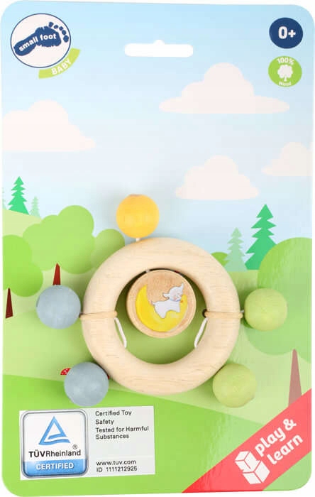 Іграшка ідеально поміщається в крихітній руці та видає цікаві звуки при струшуванні. Крім того, дерев'яне брязкальце також можна використовувати як прорізувач. Кулі кріпляться за допомогою шнурка. Все виконано в ніжних, стриманих тонах. На малюнку зображена вівця.