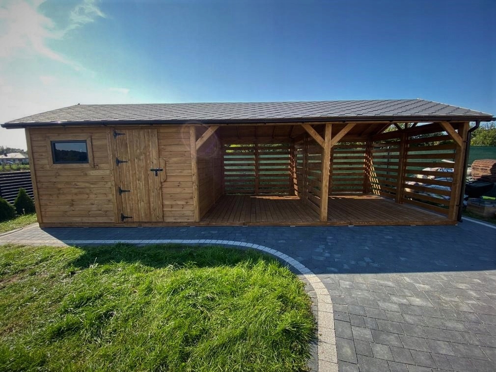 ALT DREW COSMO пропонує Вам Domek+Drewutnia Andromeda розміром 3x8м. Domek+Drewutnia Andromeda виготовлена з висушеної деревини сосни, просоченої Wood Protector в колір на ваш вибір. Покрівля з вагонки покрита бітумною черепицею (колір і форма на вибір) Будинок та інші його елементи проектуються за бажанням замовника. Ми можемо виготовити всі конструкції за розмірами замовника.