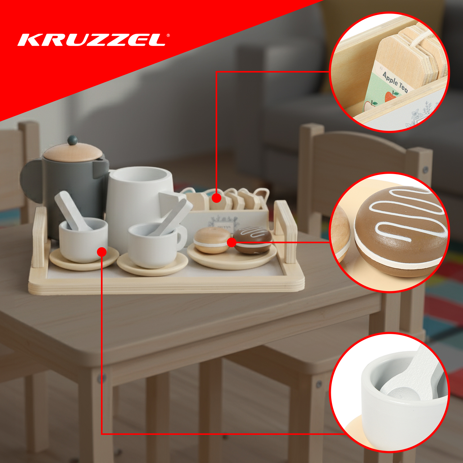 Дерев'яний чайний набір KRUZZEL - це елегантна, дбайливо виготовлена іграшка для дітей від 3 років, яка перетворює повсякденні ігри на творчі вечірки та домашні сцени. Натуральні матеріали, пастельні кольори та багатий набір аксесуарів викликають набір у захват і дітей, і батьків. Це сприяє розвитку, вчить самостійності та дарує багато радості.