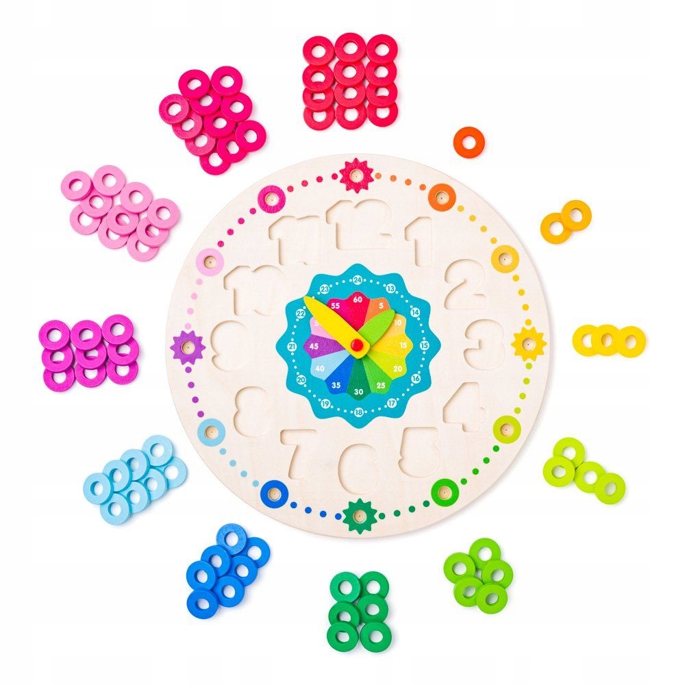 Новинка від бренду Woodyland, навчальний годинник із цифрами, ставками та кольоровими дисками. Тепер ваша дитина зможе легко зробити перші кроки в правильному читанні годин на класичному годиннику, а також в той же час зіставити та розташувати кілки та диски відповідно до їх розташування.