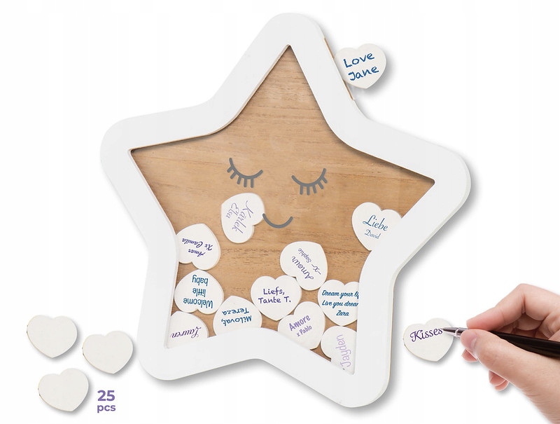 Набір містить 25 записуваних сердечок: нехай ваші друзі та родина напишуть або намалюють щось на одному з цих сердечок, наприклад, побажання або привітання з іменем гостя. Ви також можете попросити своїх гостей принести власні сердечка на вечірку для дитини та помістити їх у цю рамку у формі зірки.