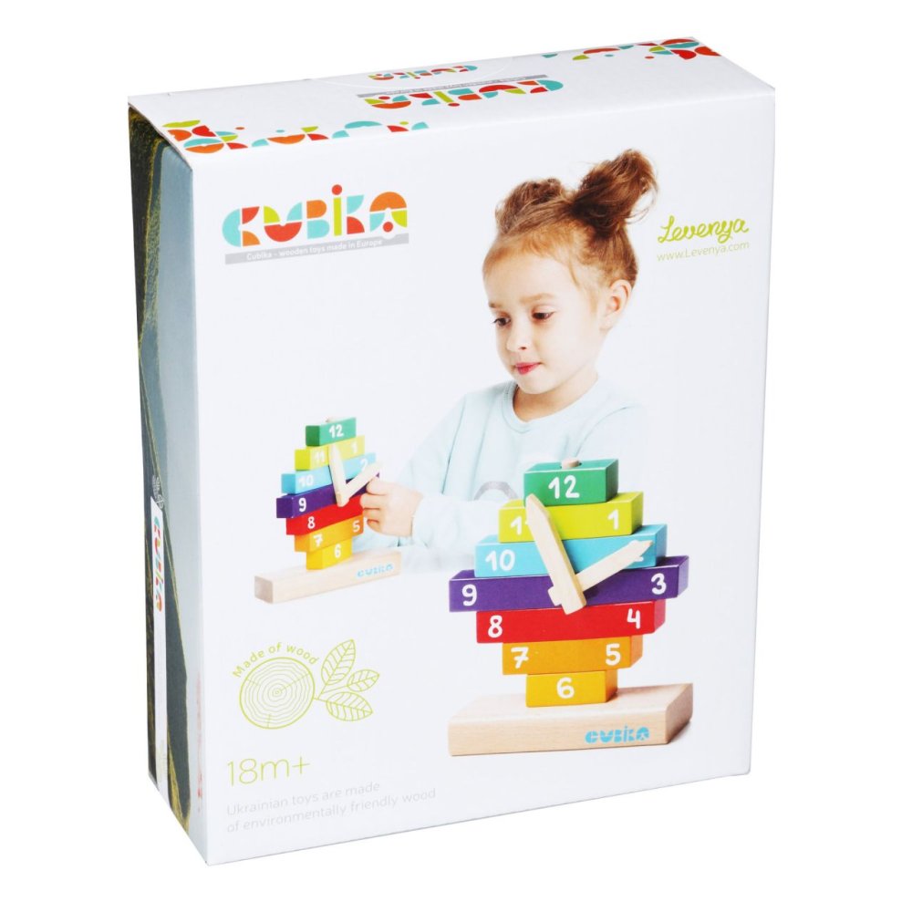 Іграшка складається з основи, 7 різнокольорових пронумерованих елементів і 2 магнітів для утримання. Дитина може зібрати годинник з дерев'яних брусків. Він вчить дитину розуміти час і підтримує розвиток моторики. Насичені кольори та елементи, які зручно тримати маленькими ручками, сприяють іграм.