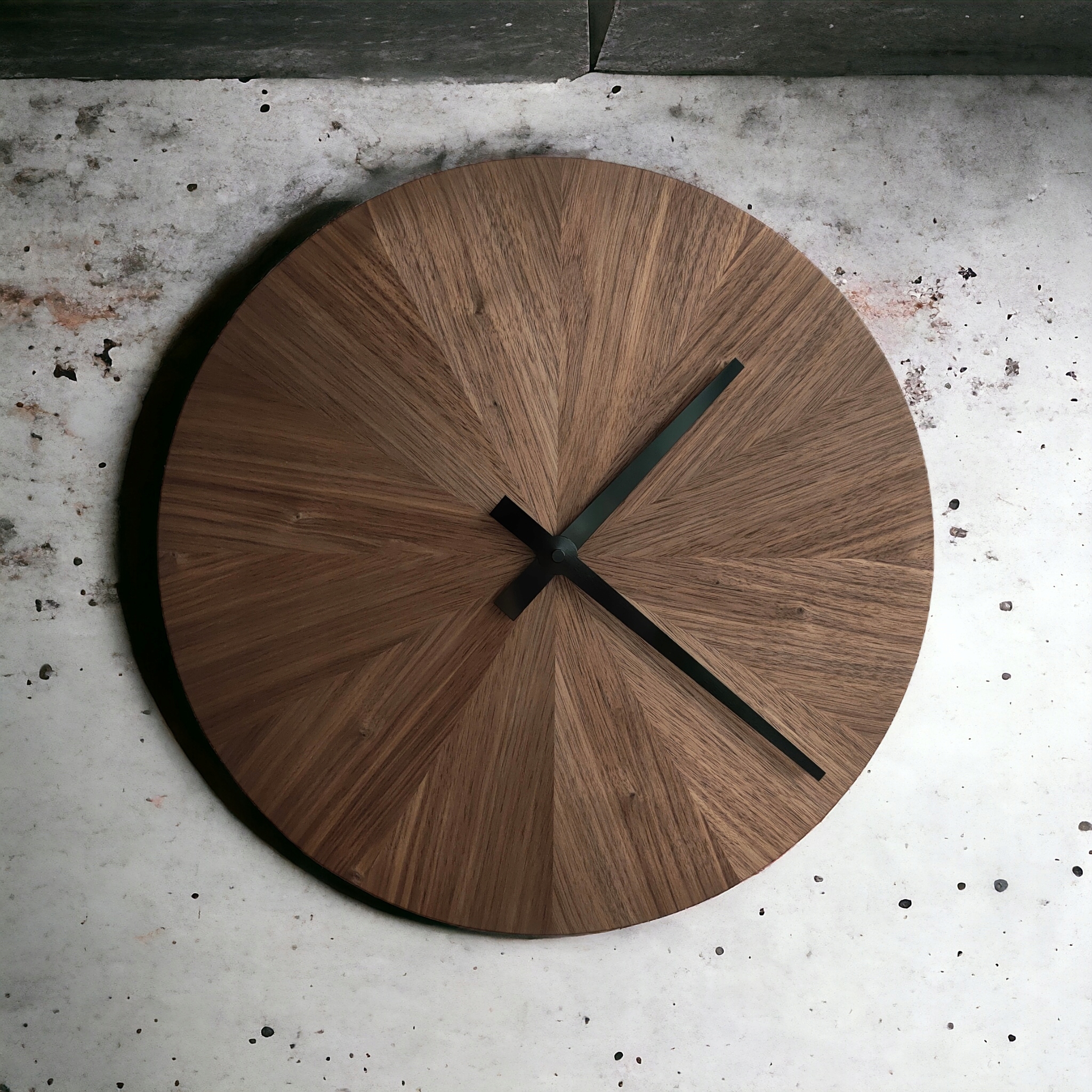 Годинник діаметром 40 см, виготовлена з фанерної плити, покритої натуральним шпоном американського горіха. Годинник захищений екологічним восковим маслом. Натуральна деревина робить кожен годинник унікальним. Кожен годинник унікальний