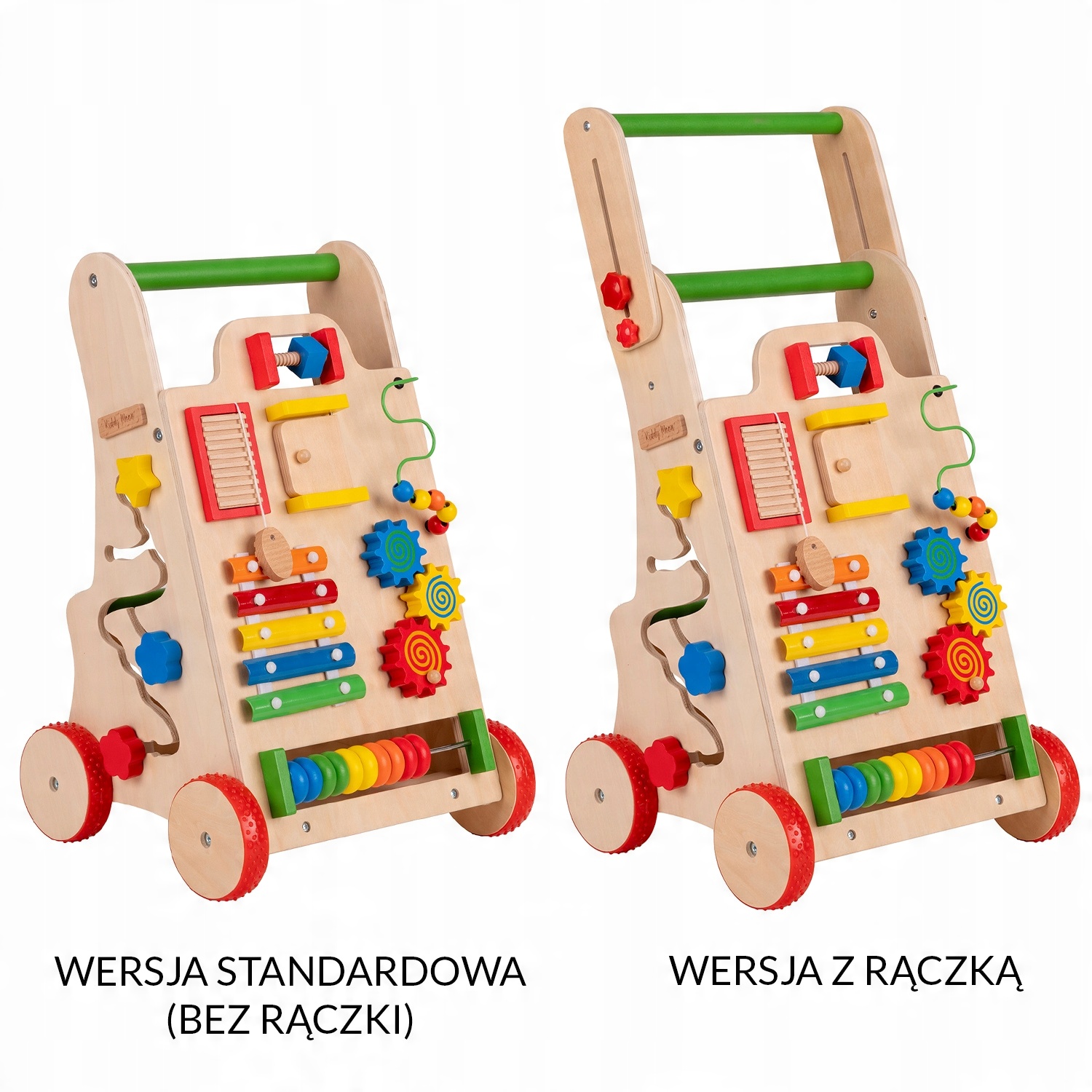 Ходунки-стійки - це іграшка, яка супроводжує дитину під час перших кроків, а також навчальна розважальний центр, що розвиває моторику дитини. Кожна зі стінок пушера має абсолютно різну функціональність і характер. Це дозволяє проводити дуже цікаву гру, яка ніколи не набридне та стимулюватиме розвиток малюка: рахівниця та тарілки, лабіринт, рухомі кульки та гвинтики, дзеркало та рухомий пазл. Ходунки також виконують функцію контейнера для іграшок, а завдяки сітці речі захищені від випадання. Має протиковзкі колеса. Іграшка виготовлена з сертифікованої високоякісної деревини, повністю безпечна, покрита нетоксичною фарбою. Варіант із регульованою ручкою дозволяє підлаштувати ходунки під зріст дитини.