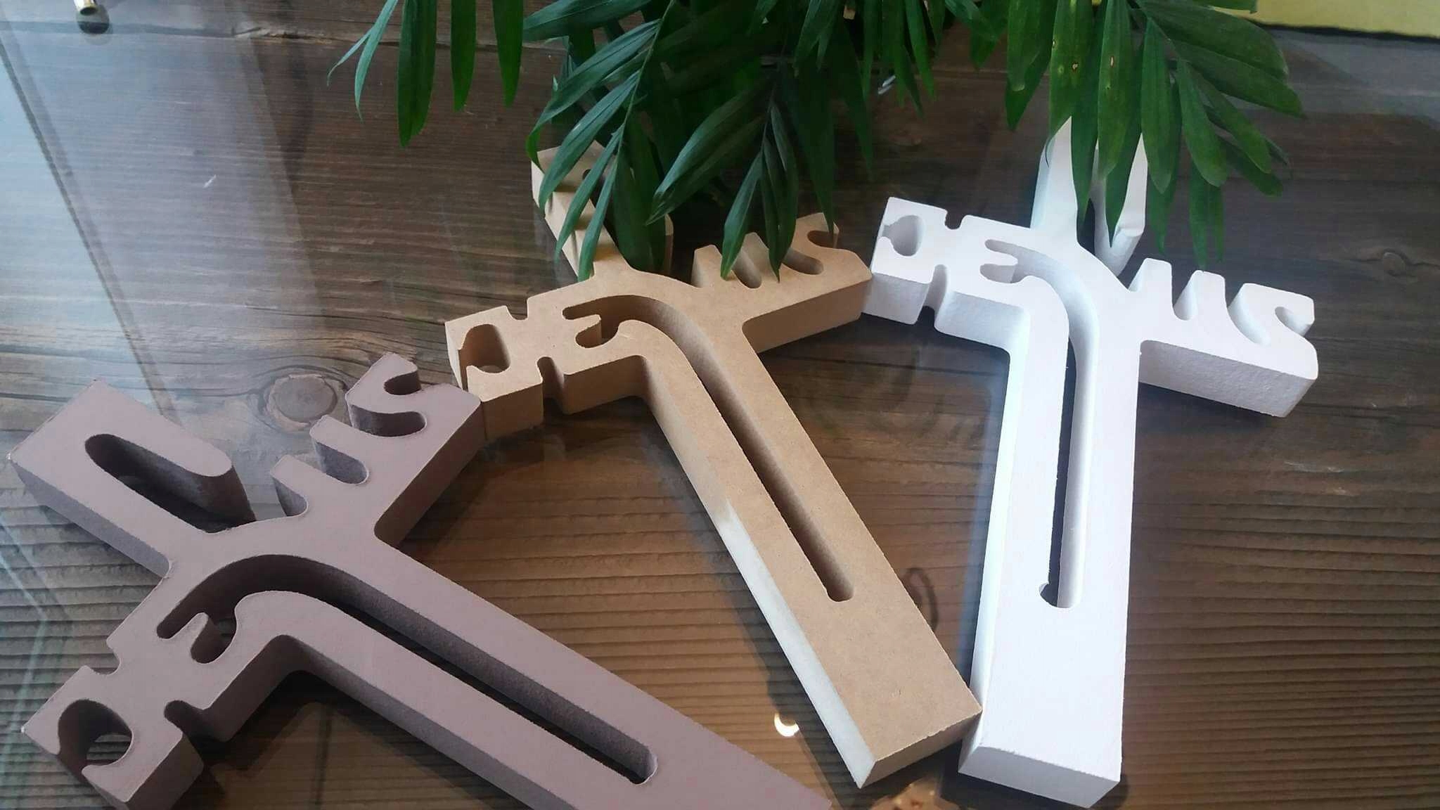 Оригінальний хрест з написом ІСУС виготовлений з дерев'яної МДФ плити товщиною приблизно 23 мм, що забезпечує його стійкість у стоячому положенні.
