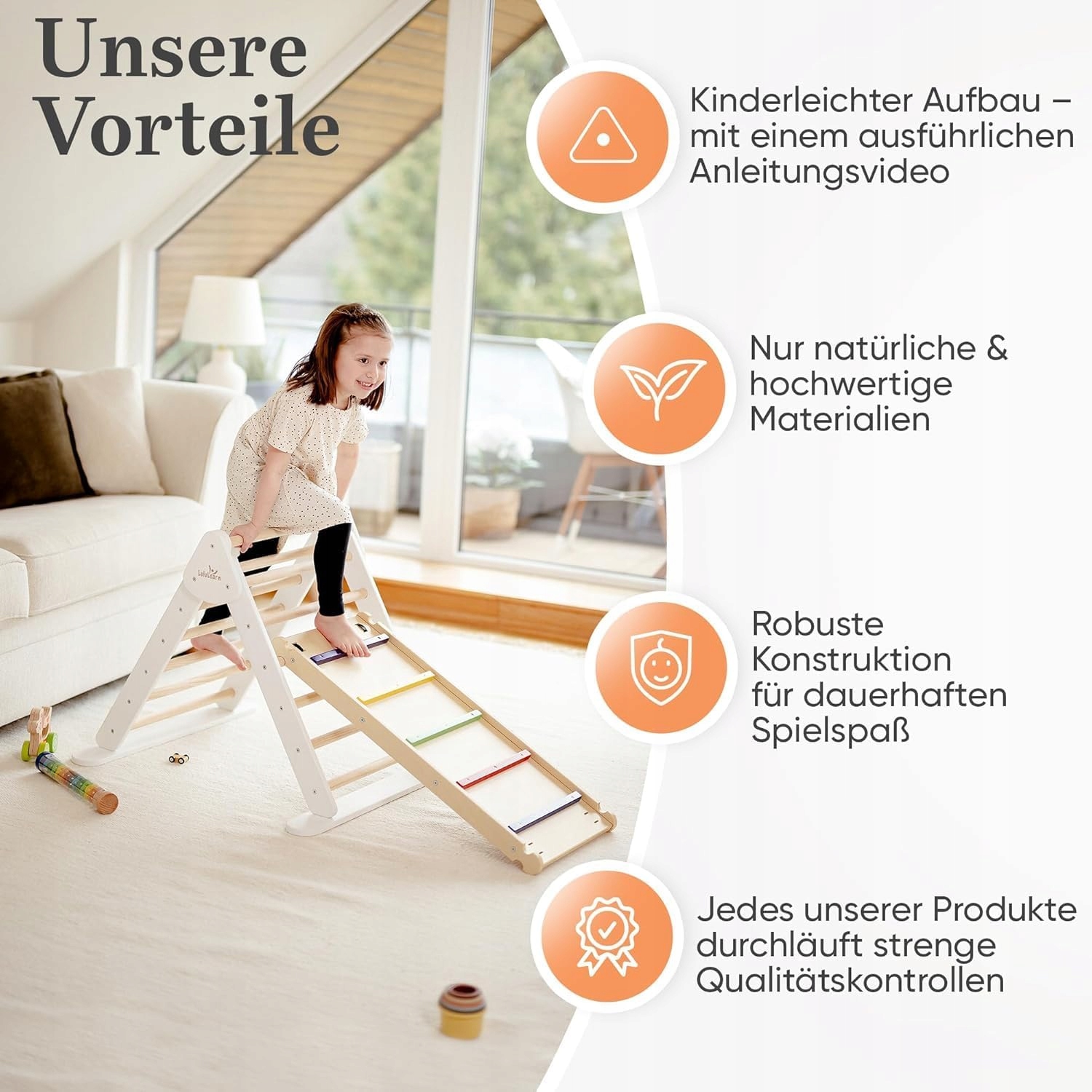 - Захист від падіння - завдяки інноваційній безпечній основі нашої сходової риштування, яка виключає ризик перекидання, а також стабільному з’єднанню між рампою та трикутником, він не тільки підтримує моторику дитини, але й захищає її від небезпечних падінь. Як батько, ви можете безпечно дивитися, як ваша дитина грає та навчається.