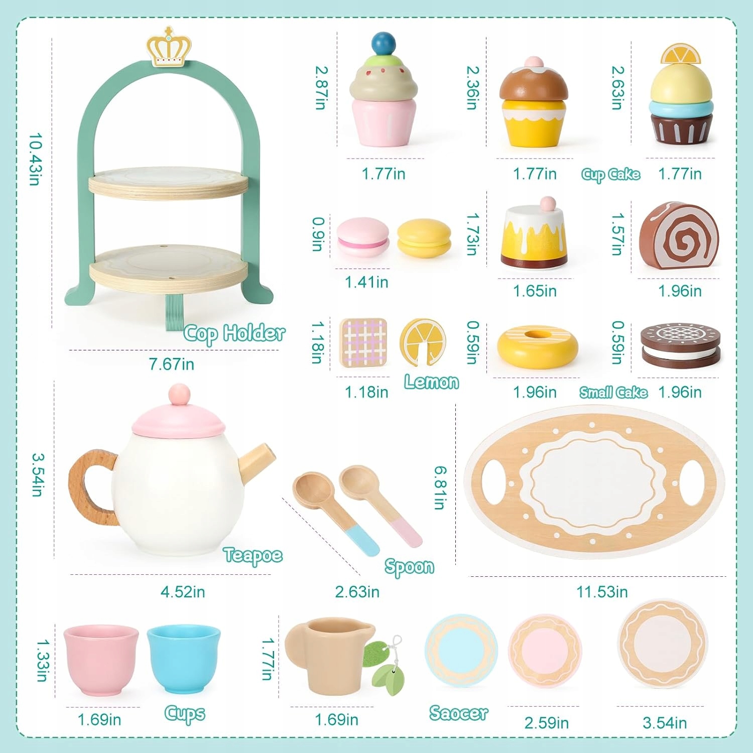 Організуйте чаювання для дітей Дерев'яний набір для чаювання з 24 аксесуарами. Завдяки цьому набору для чаювання та десертній підставці з безліччю солодощів ви можете насолоджуватися примхами нашого удаваного ігрового набору та насолоджуватися макарунами, пончики та глазуровані печива. - 🍰