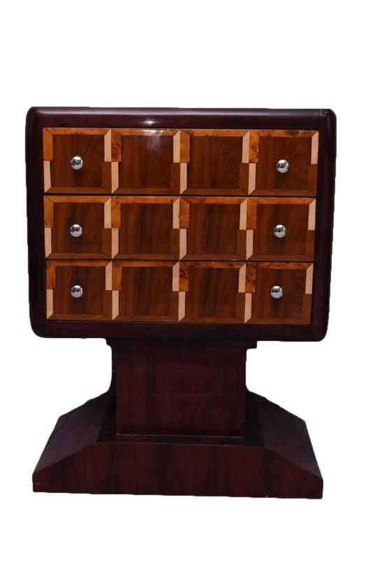 Комод із 3 висувними ящиками в стилі ар-деко — це елегантний предмет меблів, який поєднує в собі функціональність із позачасовим стилем. Виготовлений із високоякісної деревини, він вражає своїм геометричним дизайном, симетрією та благородним оздобленням, характерним для епохи ар-деко.