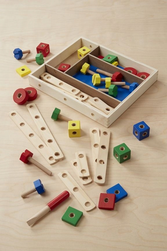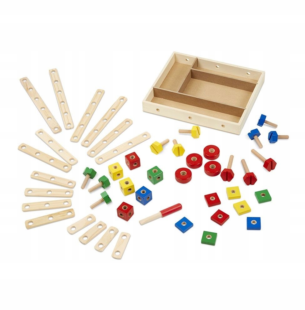 Всі елементи з дерева. Все упаковано в зручну дерев'яну коробку, в якій зручно стежити за порядком. У набір також входить листівка з пропозиціями щодо конструкцій, які можна зібрати з блоків