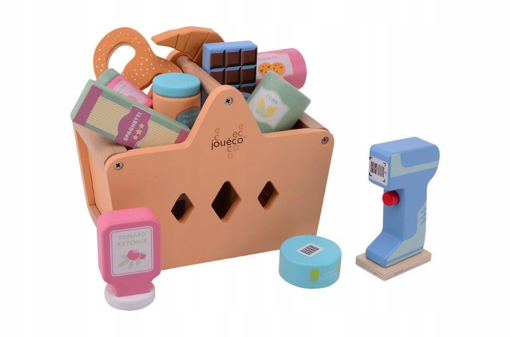 Дерев’яний Басінг -кошик та сканер joueco надзвичайно стильний і ідеально підходить для розваги в супермаркеті , на щотижневому ринку, і його можна використовувати на пікніку з друзями. Завдяки багатьом аксесуарам діти можуть брати на себе різні ролі в грі та зміцнити свої навички моторних та комунікацій . Кошик + аксесуари можна використовувати окремо або як доповнення до кухні або магазину. Дерев’яний кошик має ручку, що переносить, і наповнений до краю круасанами, печивом, шоколадом, кукурудзою, кетчупом, варенням та іншими, і завдяки сканеру веселощі в магазині ідеально!