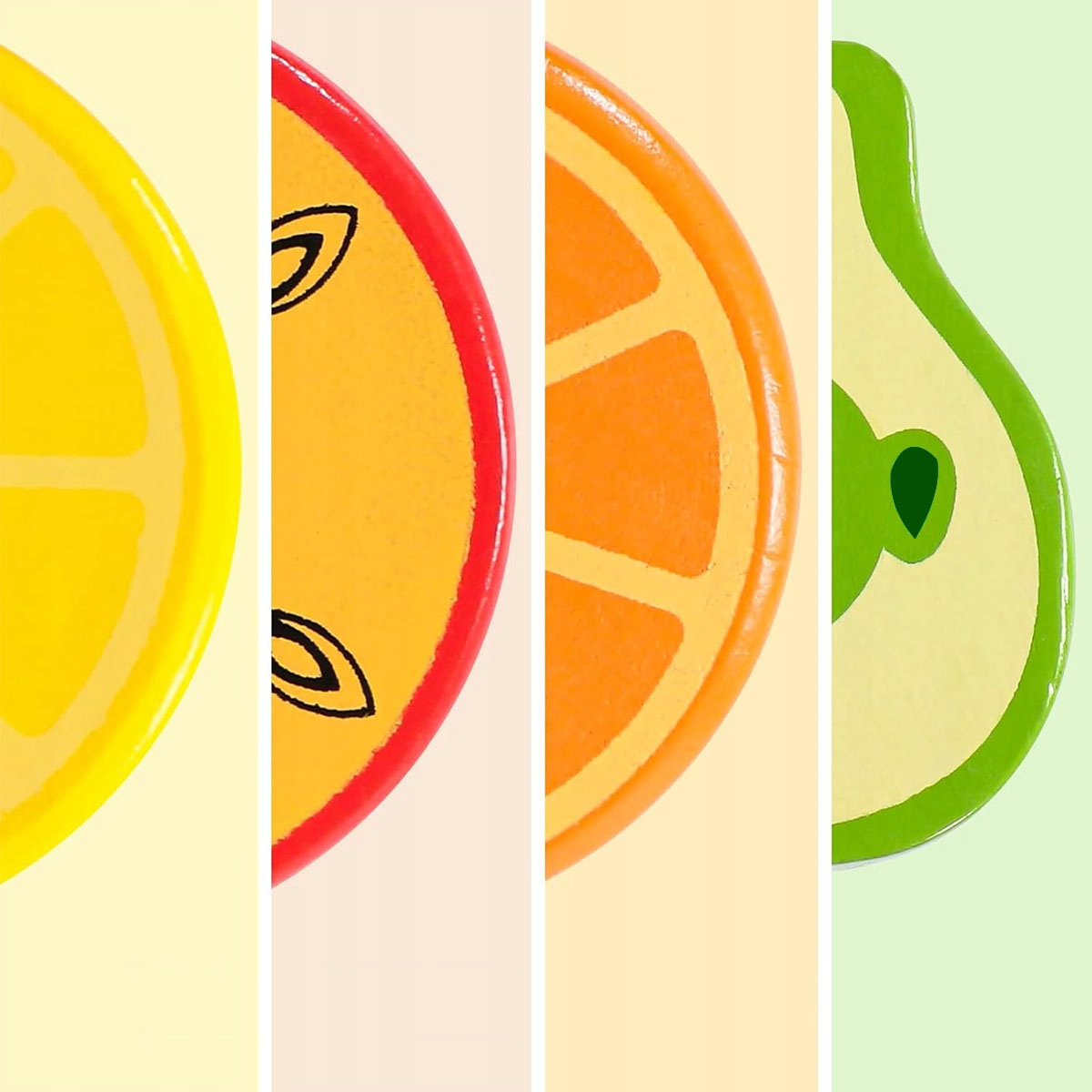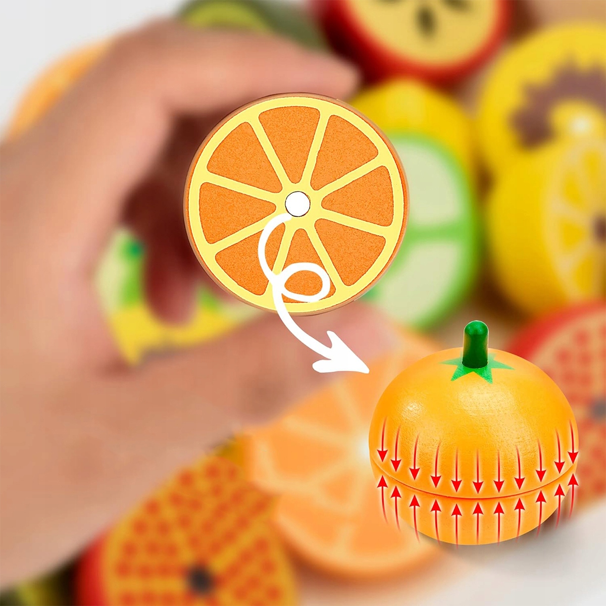 Цей набір кухонних іграшок виготовлено з високоякісної деревини та магнітних матеріалів, що робить його міцним і безпечним. Усередині кожного фрукта є магніт, тому діти можуть легко розділити або з'єднати їх. Насичені кольори привертають увагу.