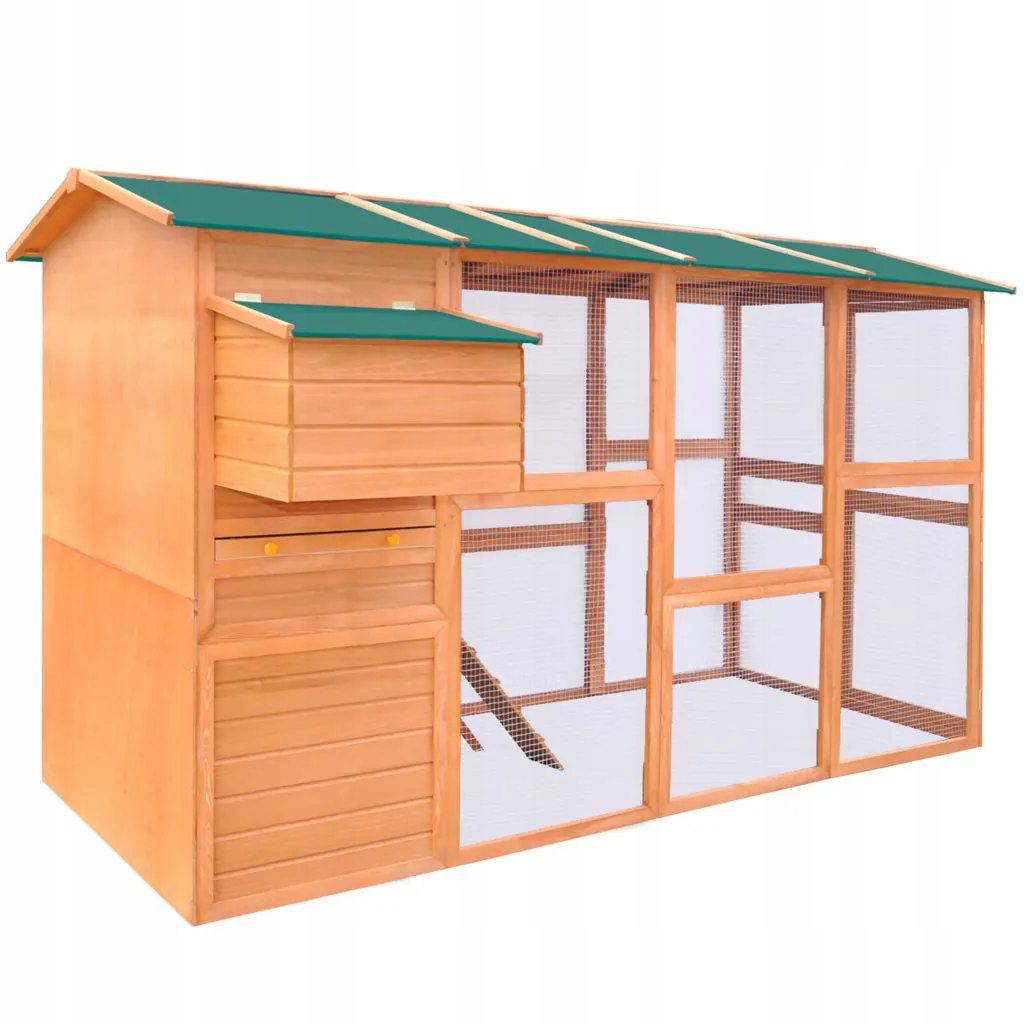 Використання високоякісної деревини сосни забезпечує довговічність курника. Зелена водонепроникна тканина на дахах захищає інтер’єр від дощу, створюючи тепле затишне місце для відпочинку курей.