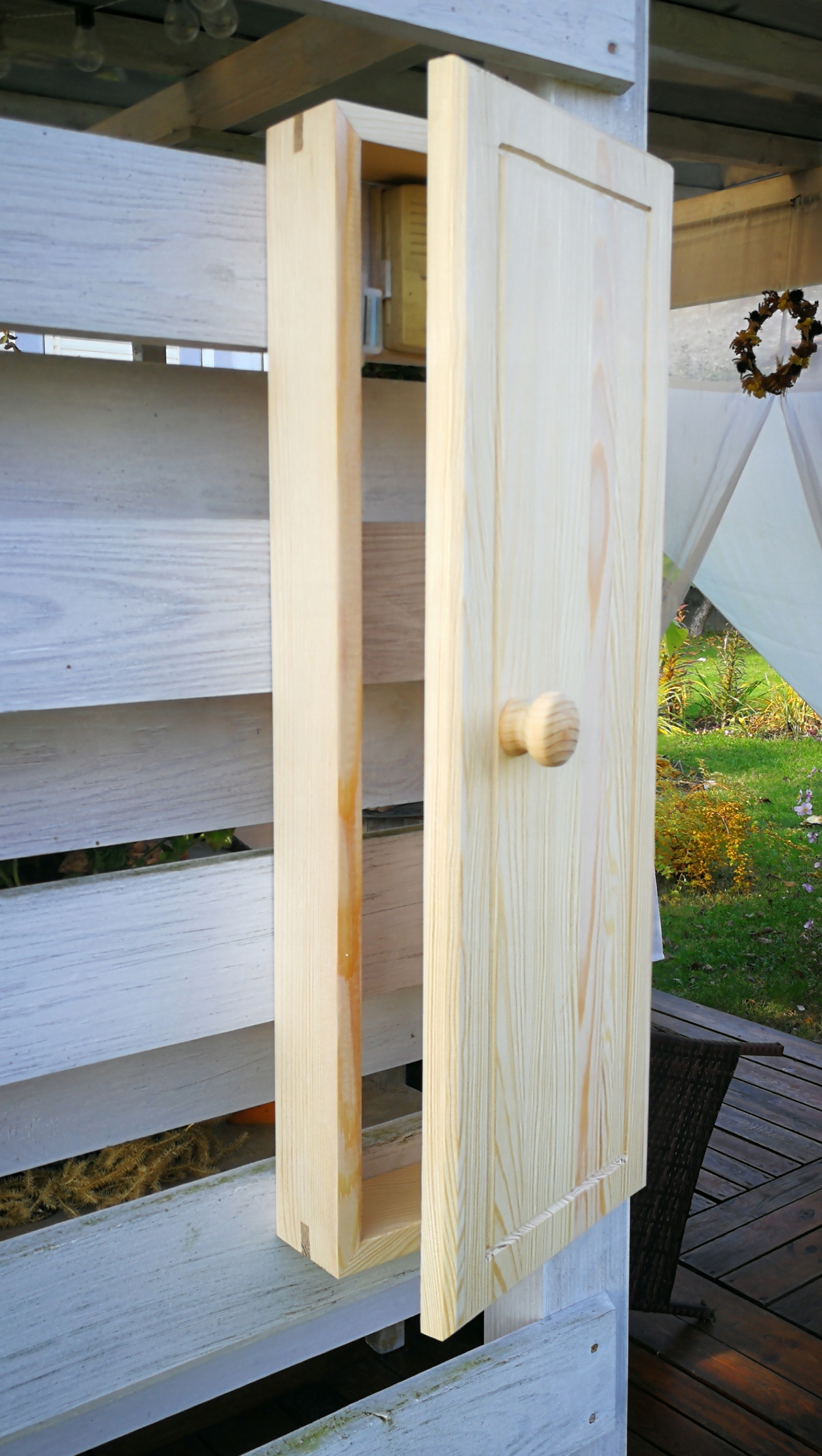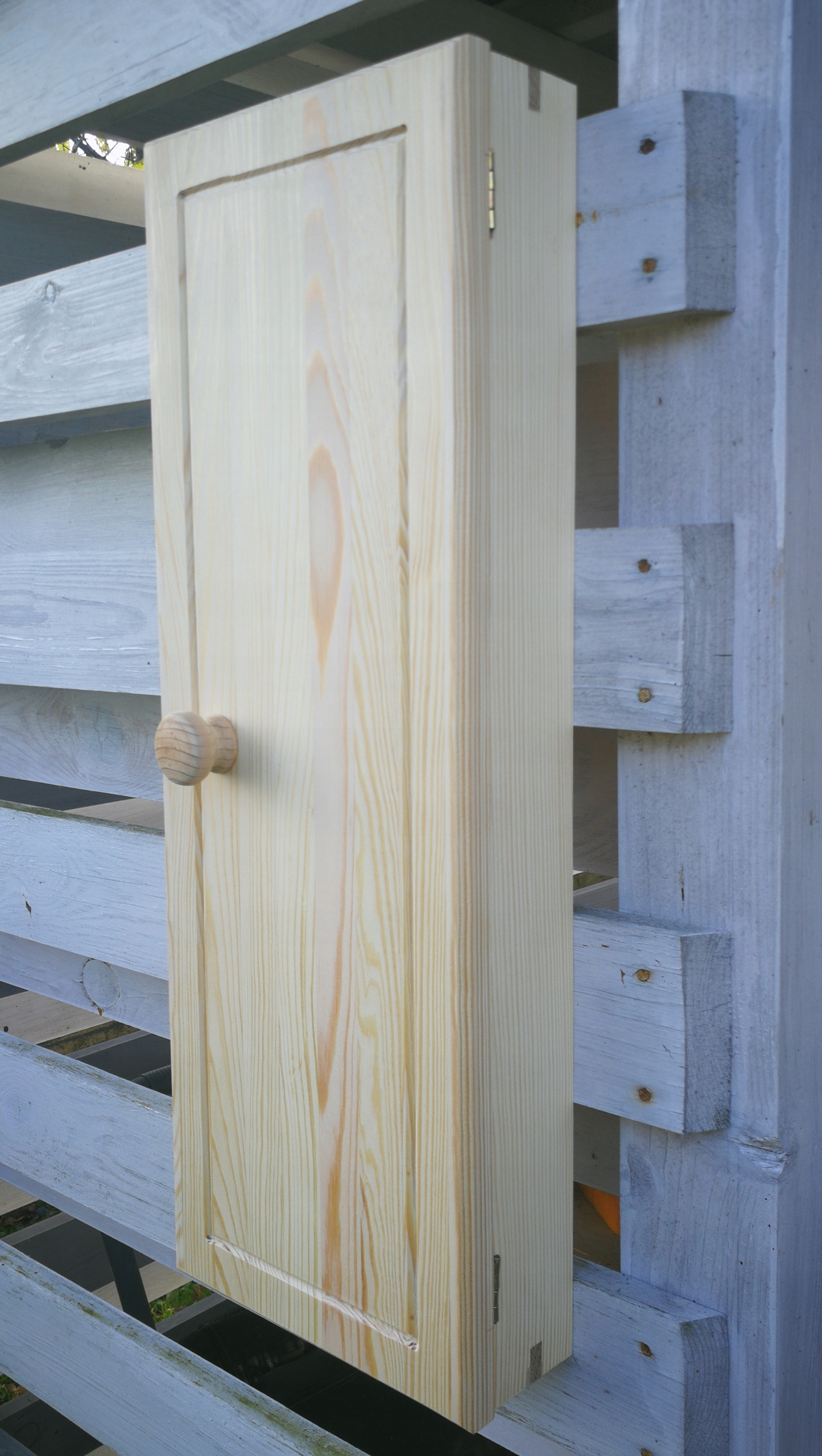 Виготовлені з безсучкової фанери сосни та пофарбовані матовим прозорим лаком. Корпус шафи виготовлений без шурупів, з використанням дерев’яного з’єднувача меранті. Цю шафу можна виготовити методом зістареної деревини: деревина оброблена щіткою, що підкреслює текстуру та структуру деревини.