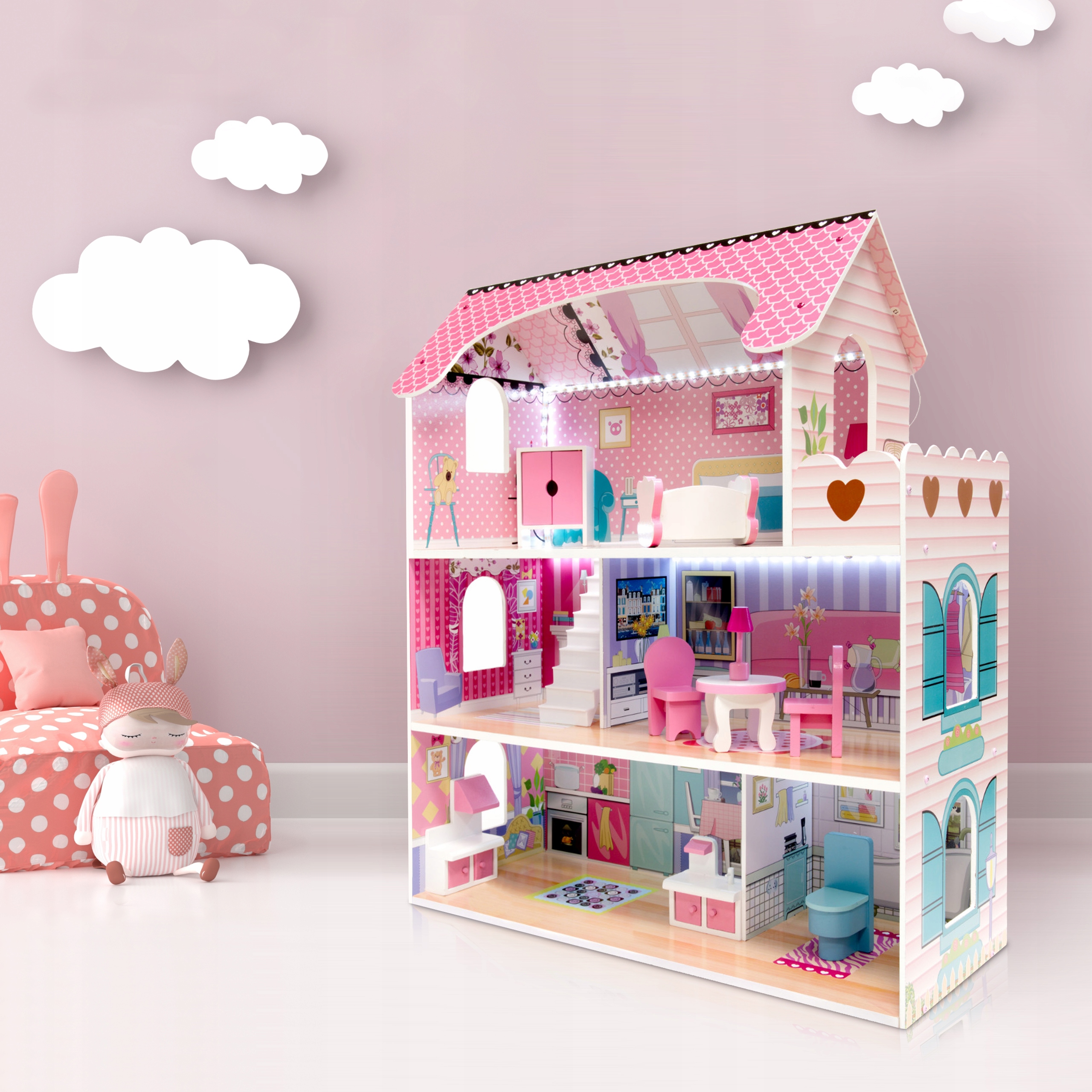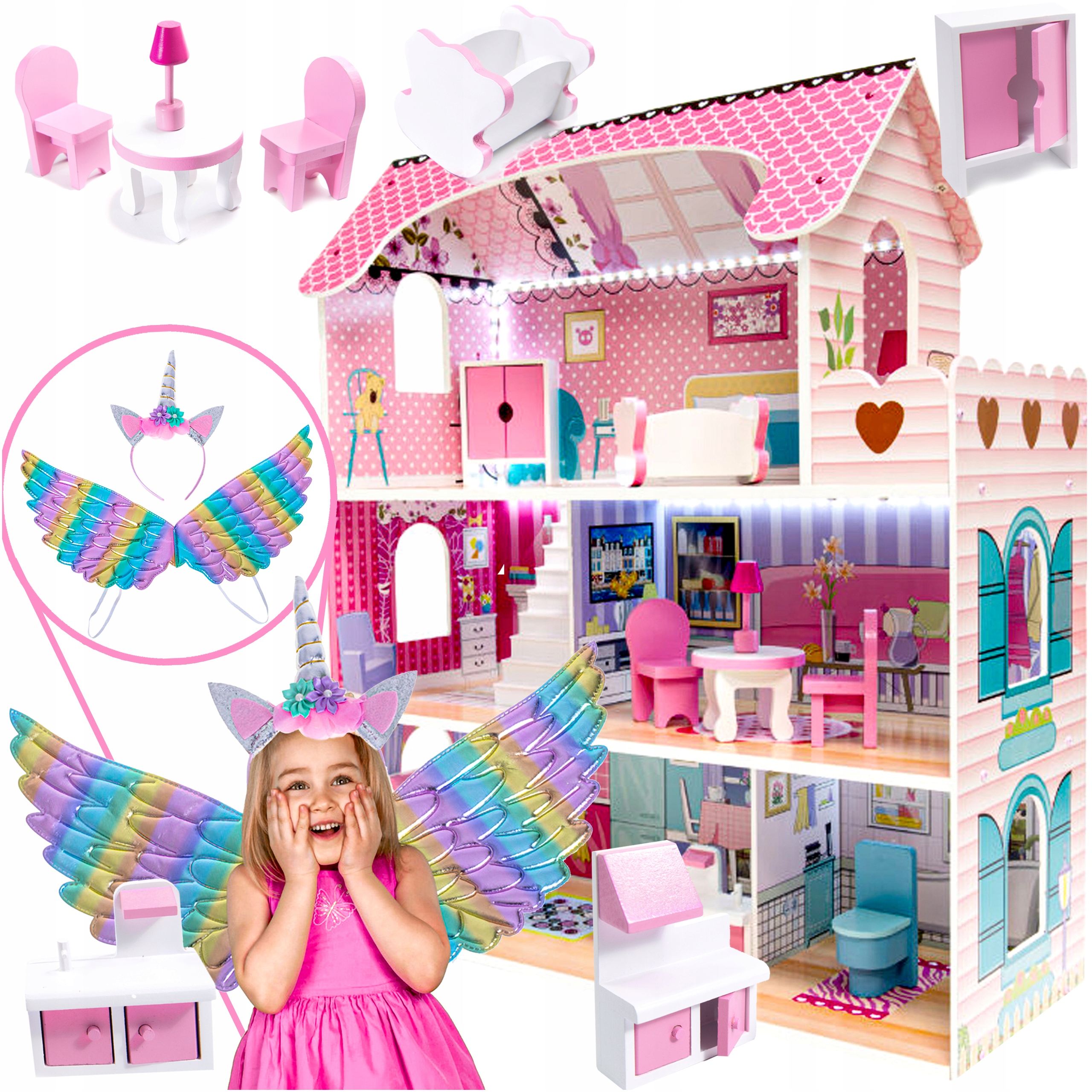 ДЕРЕВ'ЯНИЙ ЛЯЛЬКОВИЙ БУДИНОК XXXL, РОЖЕВИЙ СВІТЛОДІОДНИЙ МЕБЛІ, КОСТЮМ ЄДИНОРОГА