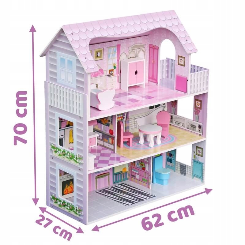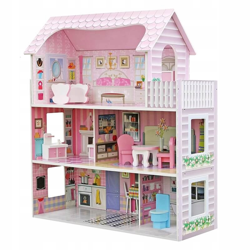 Сучасний ляльковий будиночок виглядає як справжня резиденція. У ньому є дерев’яні меблі, які можна вільно розставляти по дому за власним бажанням.
