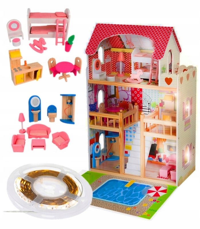 XXL ДЕРЕВ'ЯНИЙ ЛЯЛЬКОВИЙ БУДИНОК ЗІ СВІТЛОДІОДНИМ ПІДСВІТЛЮВАННЯМ БАСЕЙН + МЕБЛІ