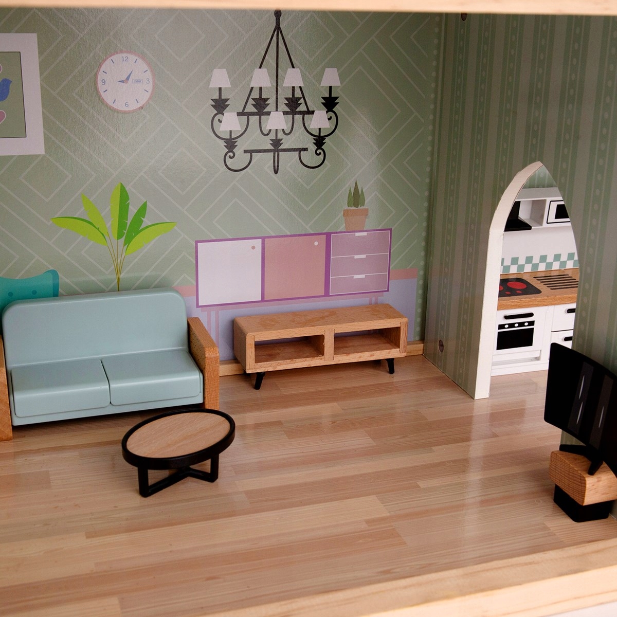 Це чудовий дерев’яний ляльковий будиночок зі світлом і звуком, який містить меблі та багато дизайнерських деталей.