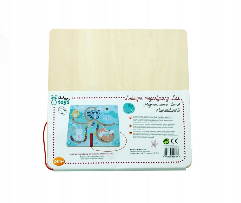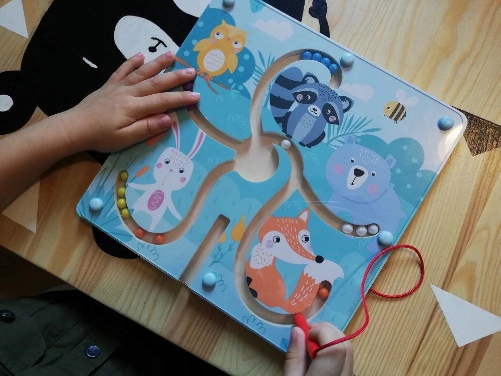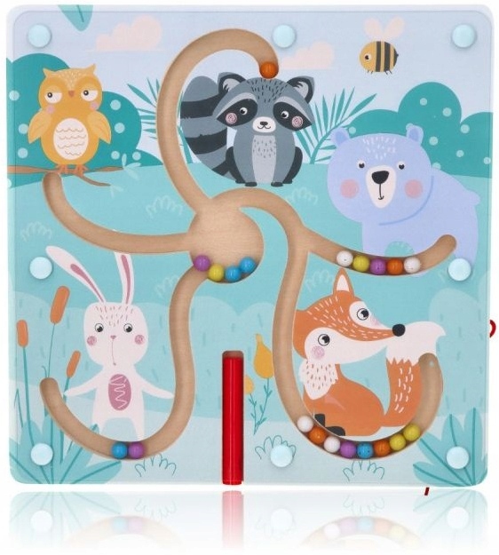 Магнітний лабіринт являє собою дерев'яну дошка з принтами лісових тварин.З'єднані між собою не дають кулькам висипатися. Магнітна паличка, прикріплена до основи, з’єднується з цілим шнурком.