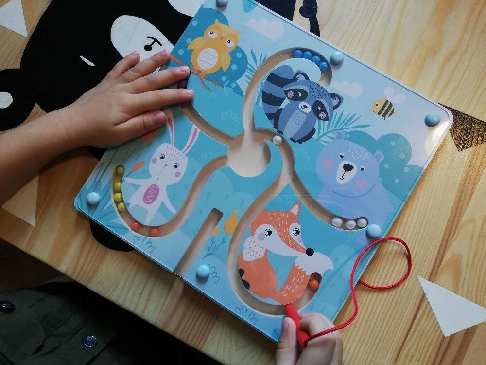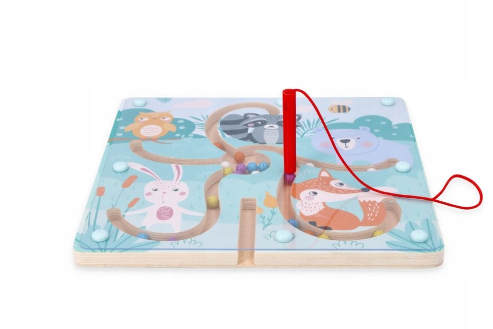 Магнітний лабіринт являє собою дерев'яну дошку з красивим принтом лісових тварин, покриту прозорим пластиковим склом. З'єднавшись разом, вони не дозволяють кулькам висипатися. Магнітна паличка, прикріплена до основи і з’єднана з нею за допомогою шнурка, теж має своє місце. Гарантована якість, іграшка, створена з найвищою точністю від бренду Adam Toys.