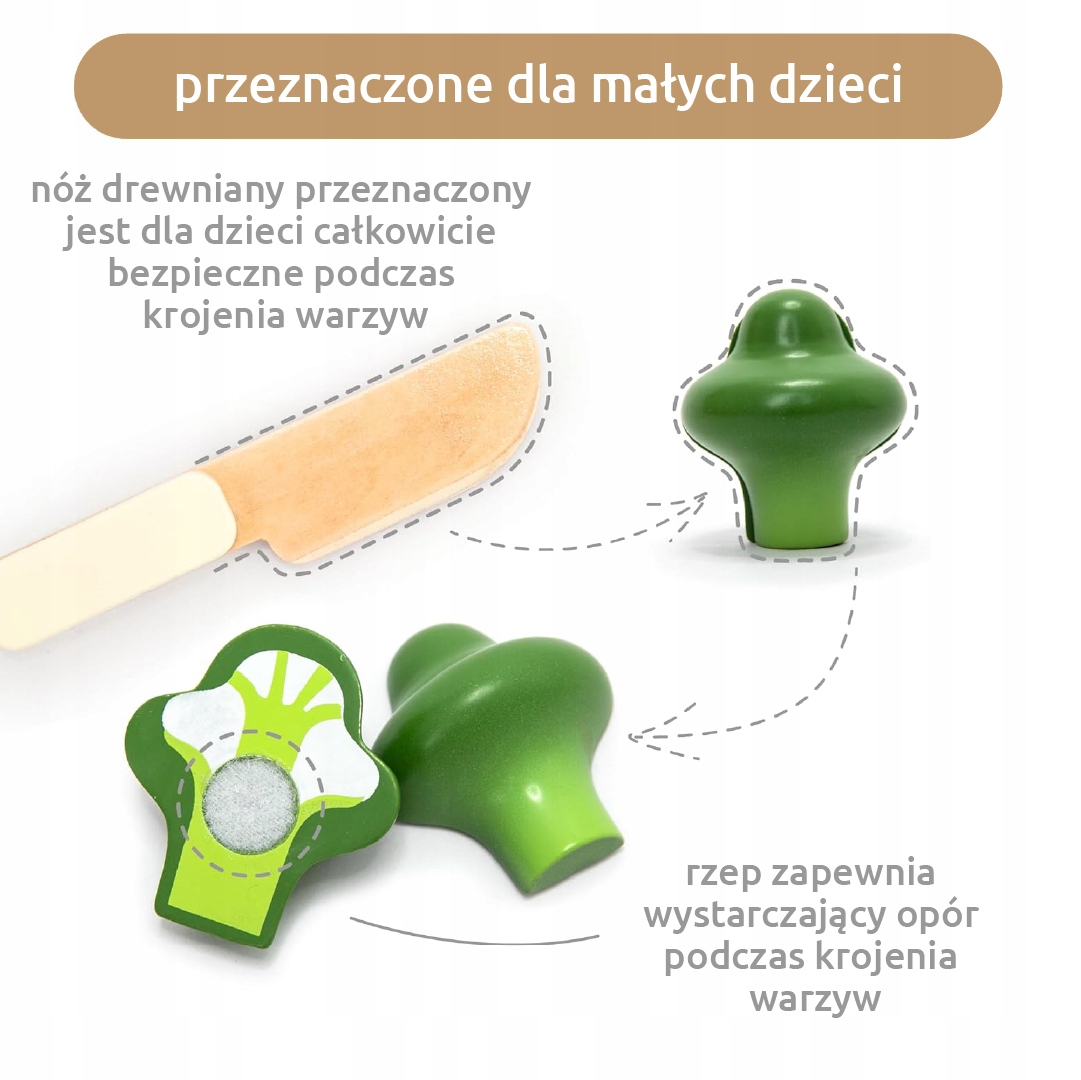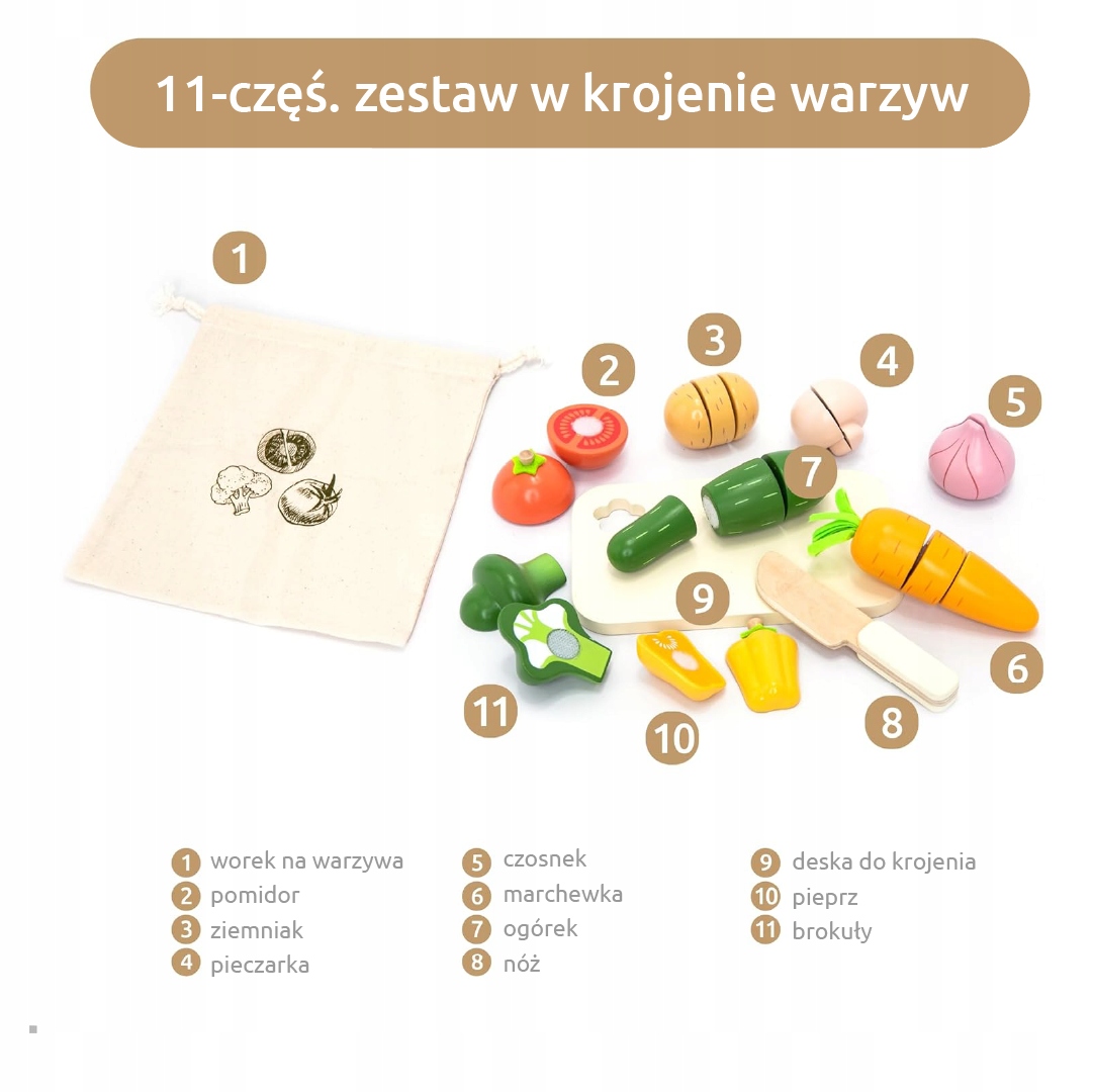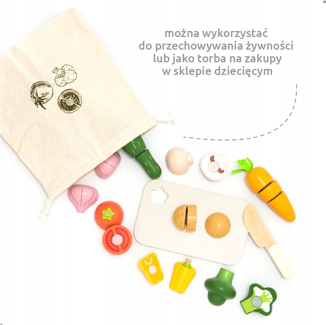 Цей аксесуар для дитячої кухні також стане чудовим доповненням. Містить різні овочі, включаючи дерев'яний ніж і обробну дошку. Окремі частини овочів належним чином з’єднані за допомогою липучок, що робить процес нарізання для найменших максимально реалістичним.