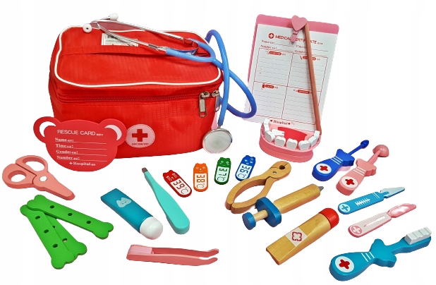 Дерев'яний набір медичного приладдя для маленьких любителів пограти в лікаря чи медсестру. Валіза вщерть заповнена ліками, приладдям для медсестер і стоматологією.