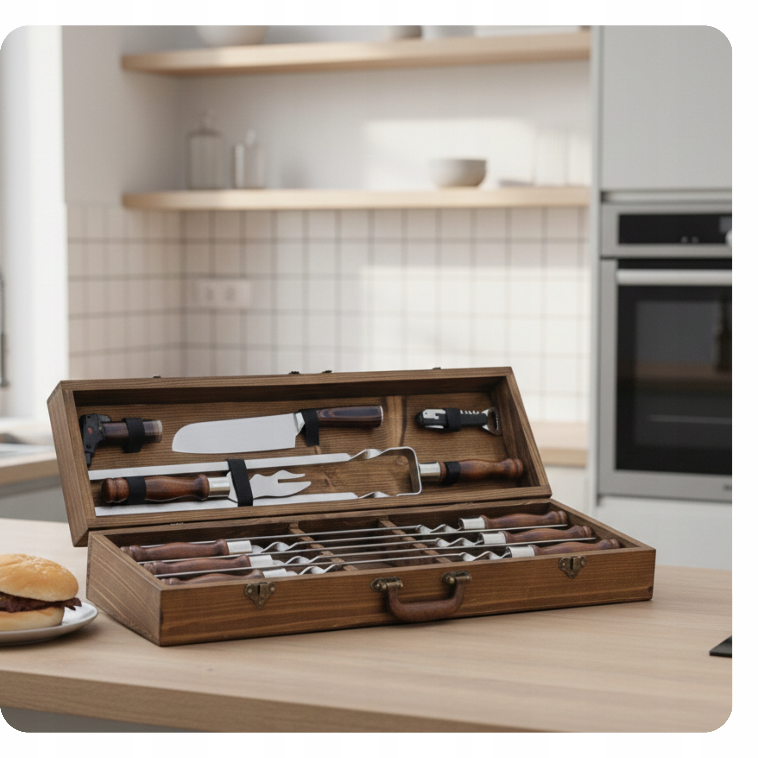 Дерев'яна коробка ручної роботи з ручкою робить набір ідеальним подарунком для любителів шашликів, пікніків і застіль на природі.