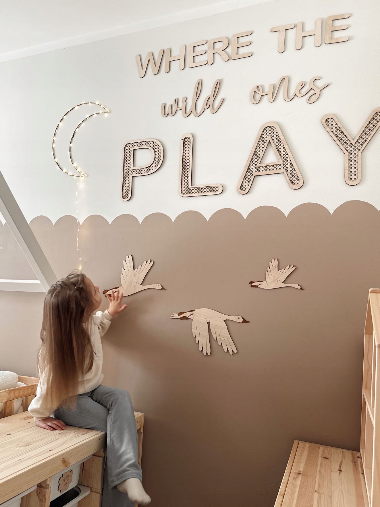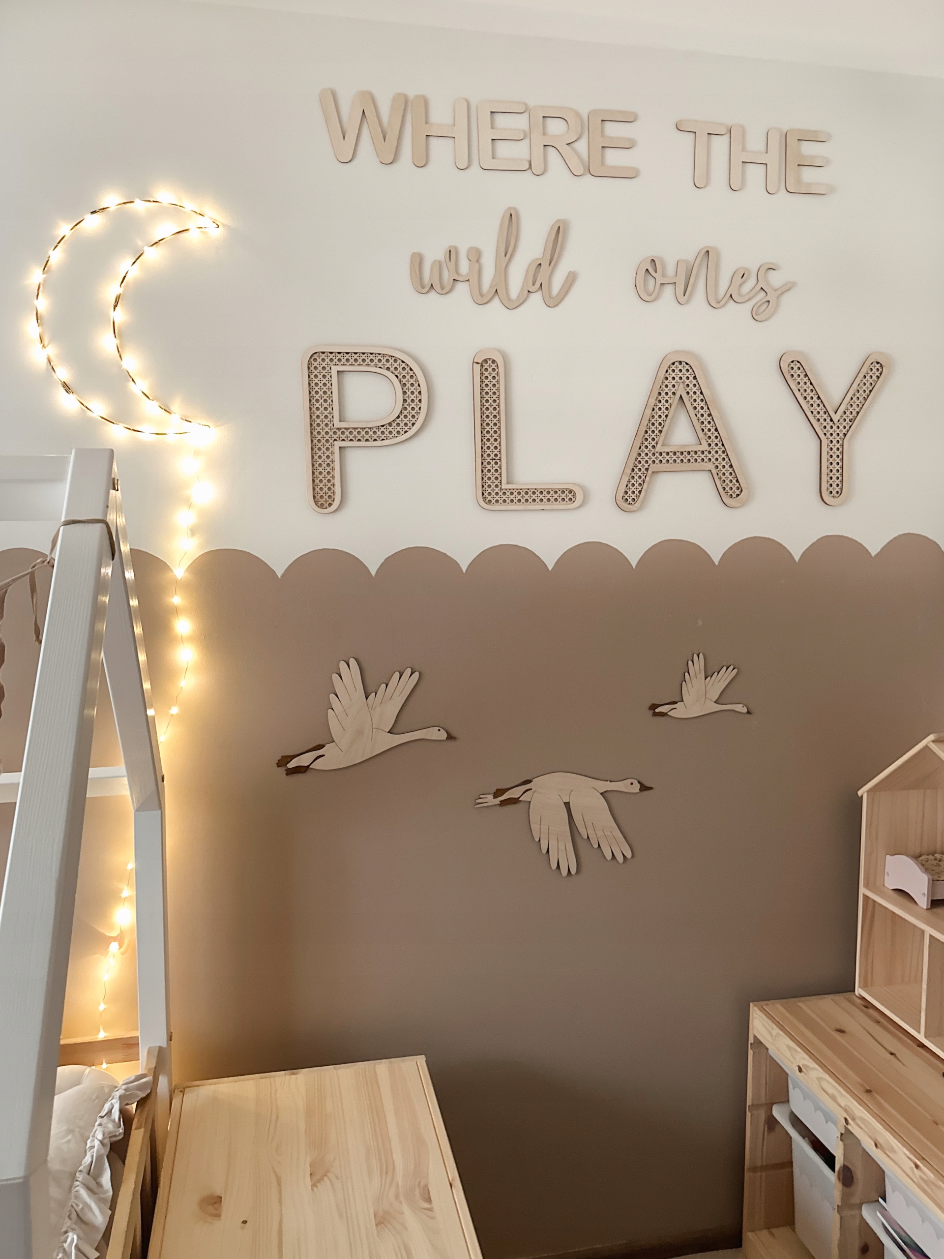 Дерев'яний напис «Де ГРАЮТЬ дикі» для наклеювання на стіну зробить кімнату вашої дитини ще більш затишною та чарівною! Напис PLAY виконано з ротангової фанери 6-7 мм.