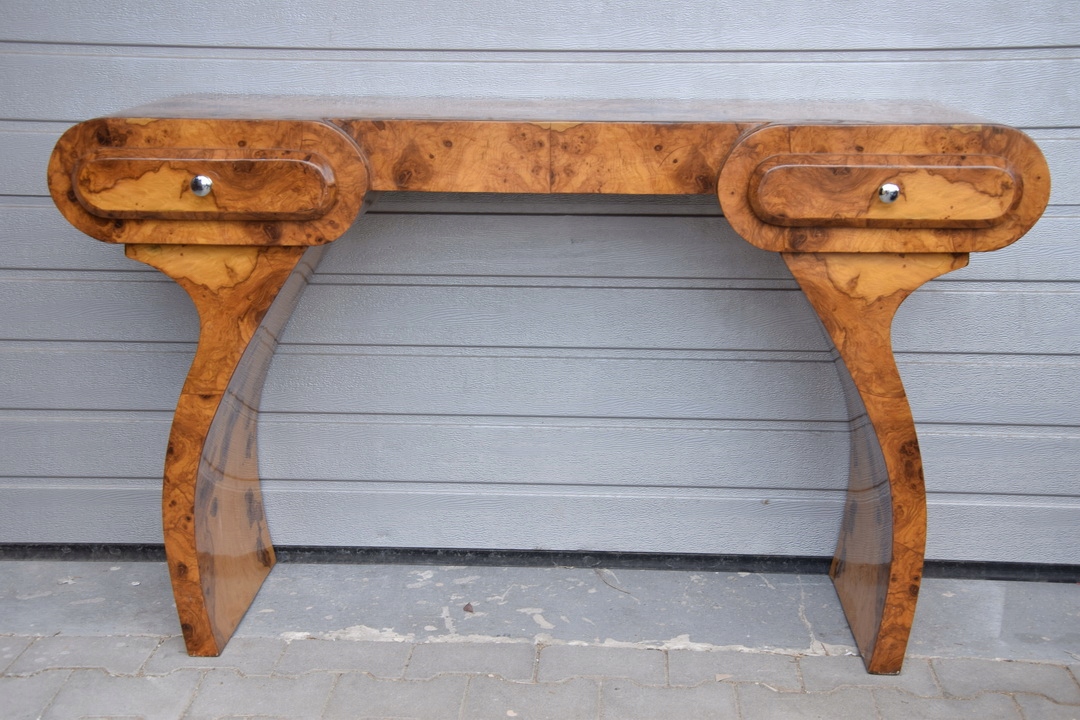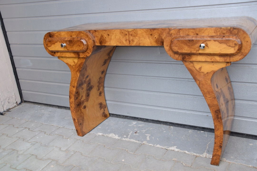 Підсумок: Це дерев'яний стіл/стіл/консоль/письмовий стіл з двома ящиками - це поєднання класичної краси стилю арт-деко з сучасною функціональністю. Чудовий вибір для тих, хто цінує елегантність, якісну роботу та унікальний характер меблів з душею.