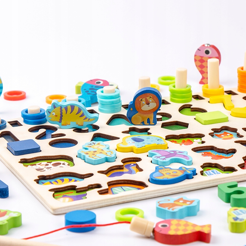 16 тварин, 10 транспортних засобів і 10 номерів для комплексного вивчення Абак і математичні знаки для складання простих рівнянь Інтерактивна гра на риболовлю Яскраві кольори, заохочення до вивчення кольорів Зручна дерев'яна підставка, ідеальна для гри вдома та під час подорожей.