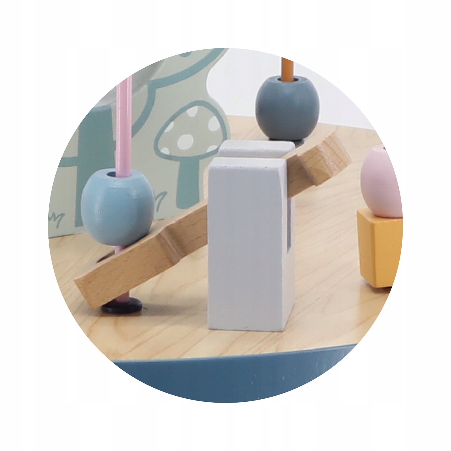- Є дерев'яні різнокольорові блоки та три блоки із зображеннями тварин - плюшевого ведмедика, лисиці та їжака - на металевих петлях. Малюк може як завгодно рухати кубики, відпрацьовуючи точність рухів пальчиків і рук.
